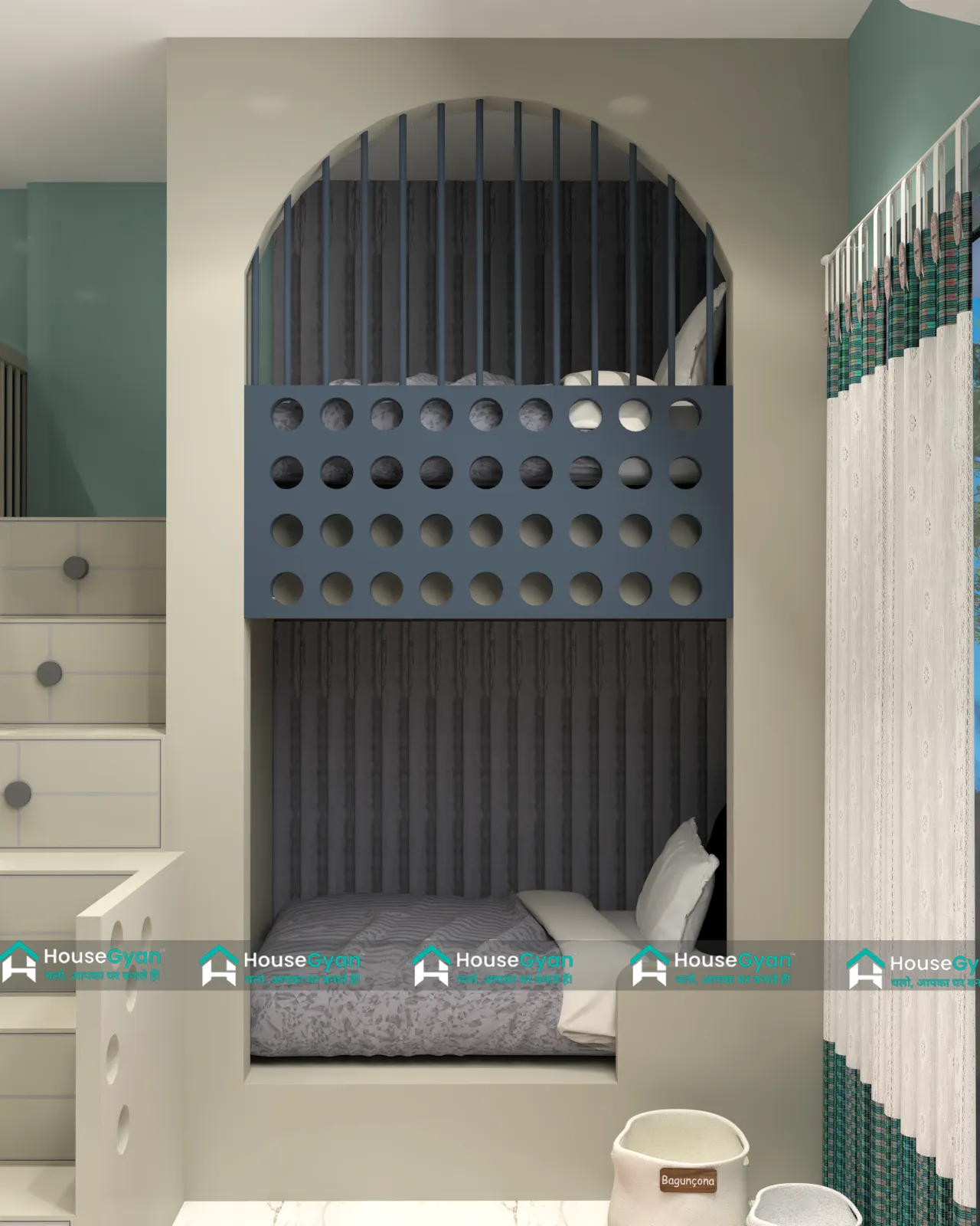 A modern bunk bed design in deep blue color featuring a stylish partition with circular cut-outs. The arched niche frame and vertical railings add a u...
