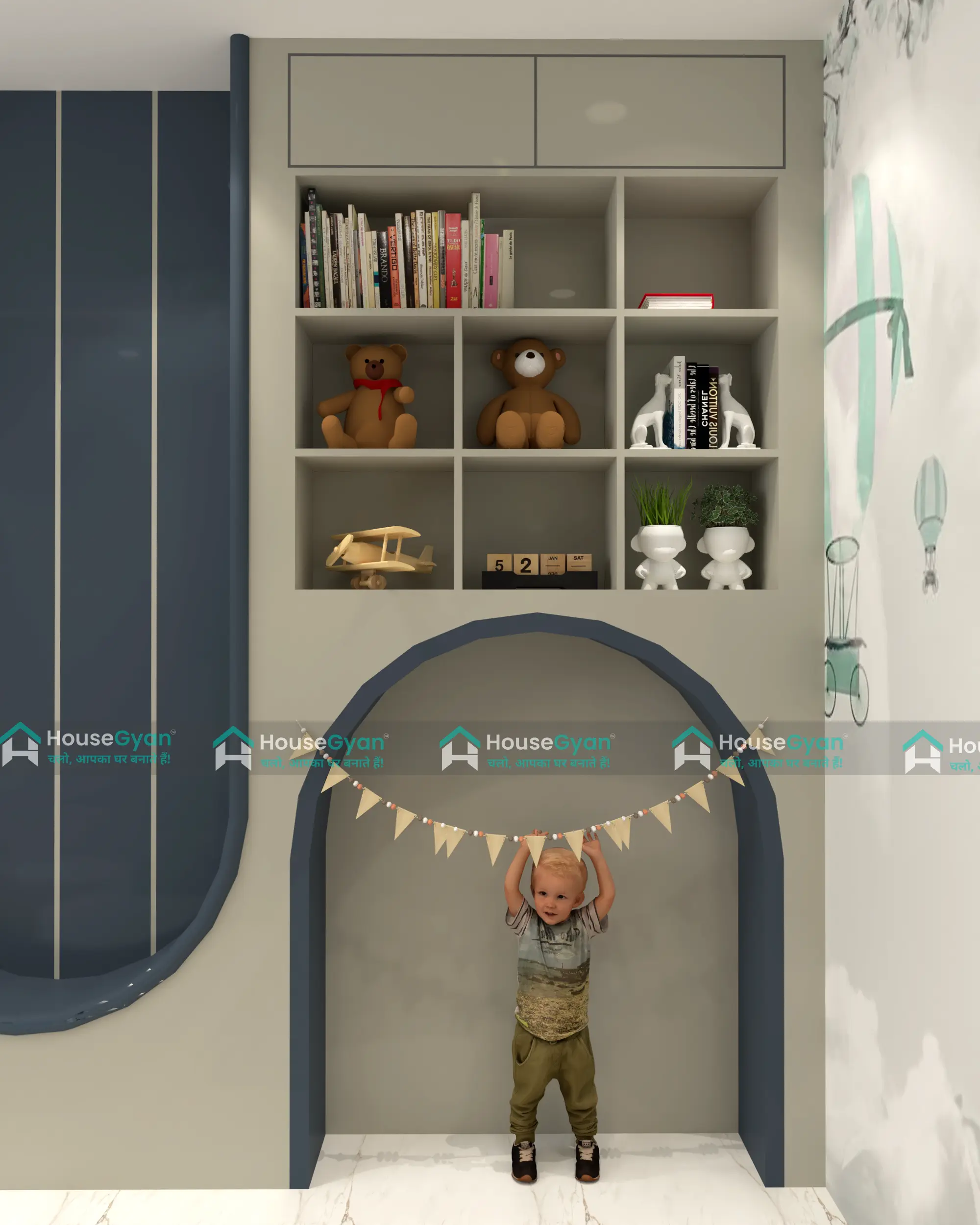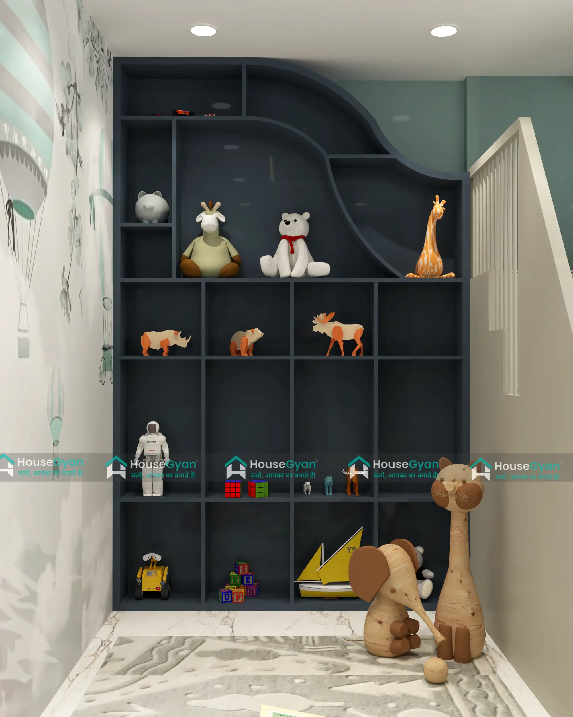 This kids room showcase design features a fun curved layout with cheerful colors that adds a playful and creative vibe to the space. The open shelving...