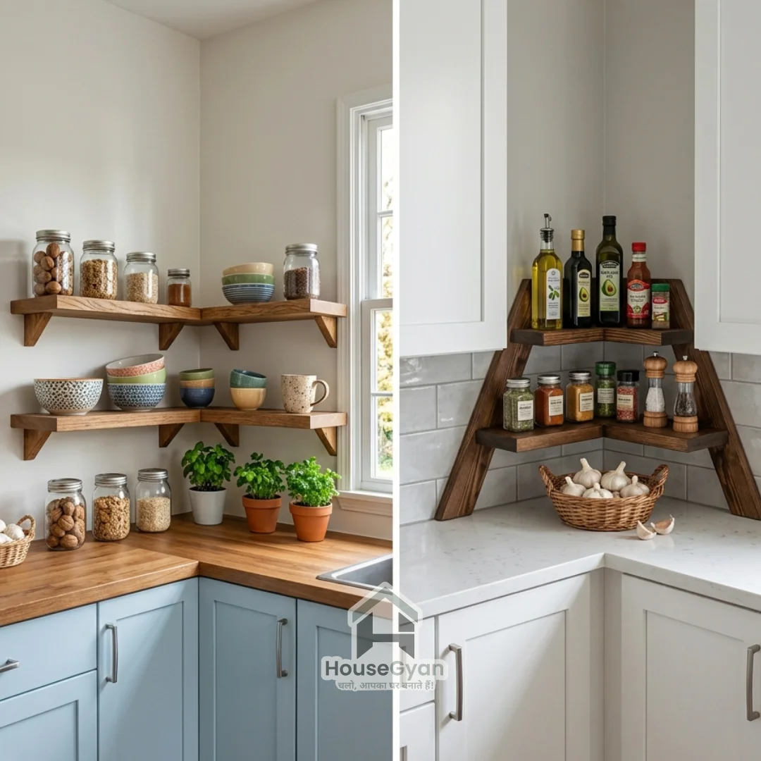 Corner wall shelves, as they provide the best space-saving ideas for the kitchen, especially in the space between two kitchen counters, where the corner wall shelf can be used for the storage of condiments.