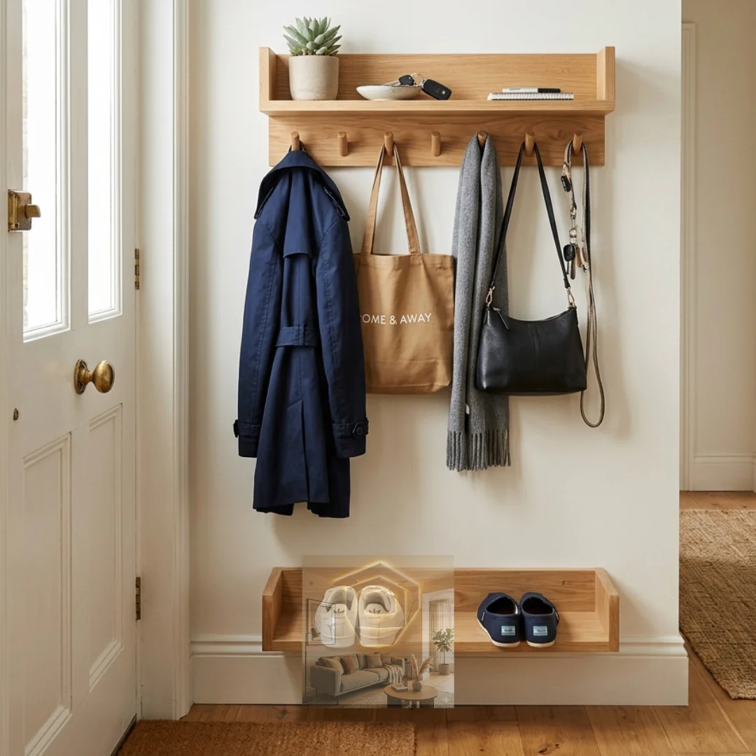 Single shelf with hooks below to keep keys, bags, and coats in one compact space.