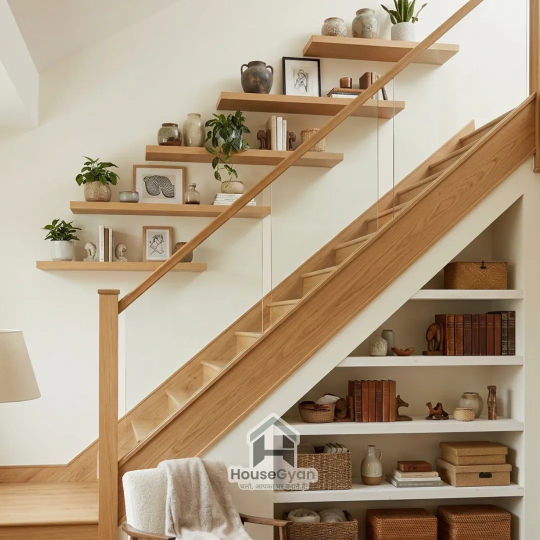 Staggered floating shelves ideas following the stair angle to turn a long-overlooked wall into a display zone.