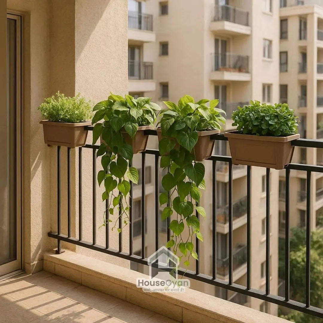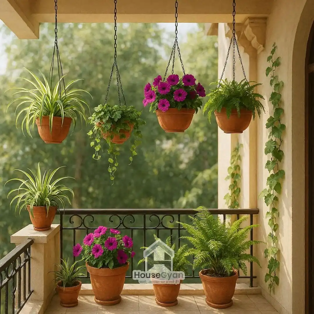 Hanging planters are simple balcony decoration ideas that add beauty without taking space.
