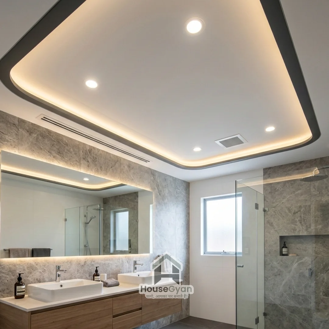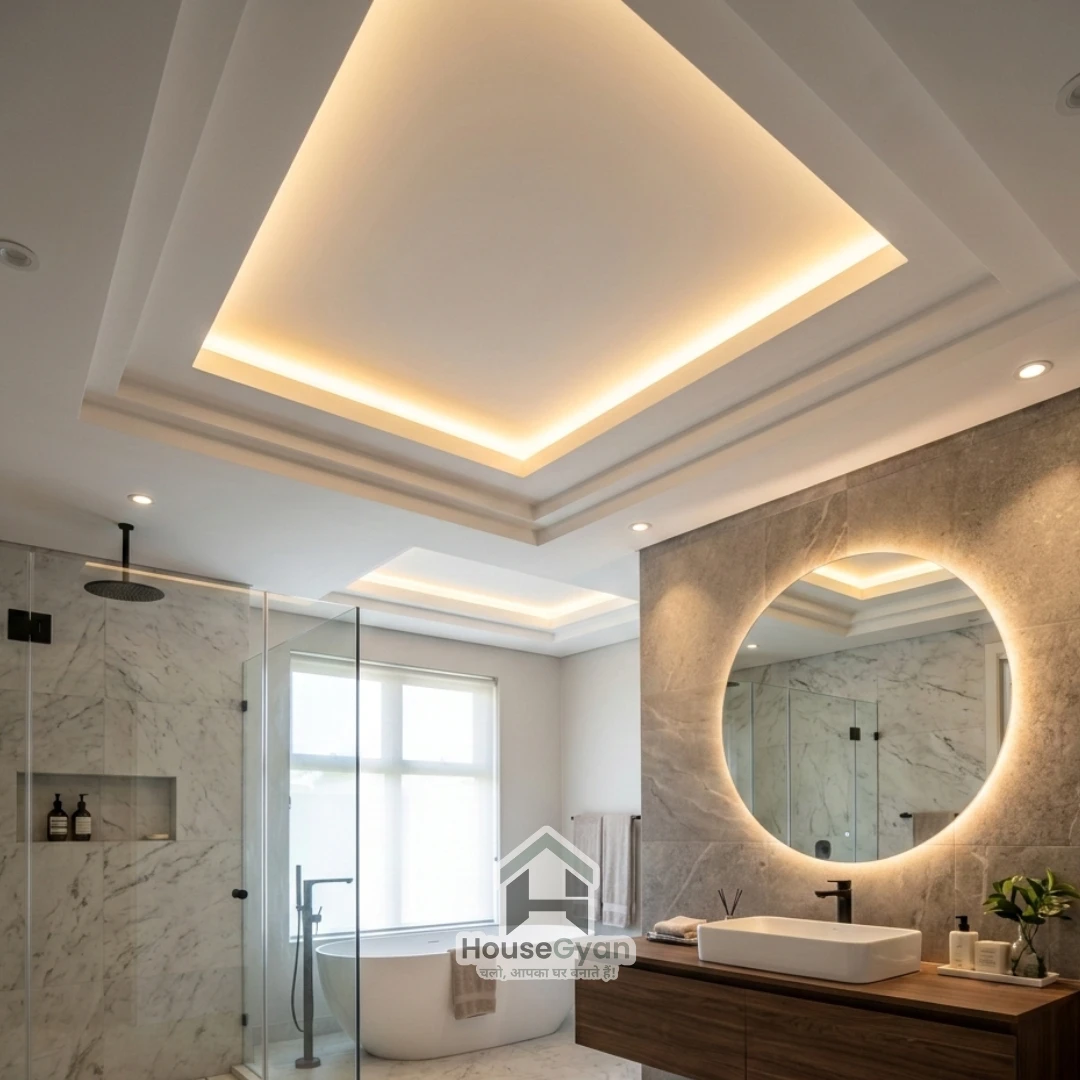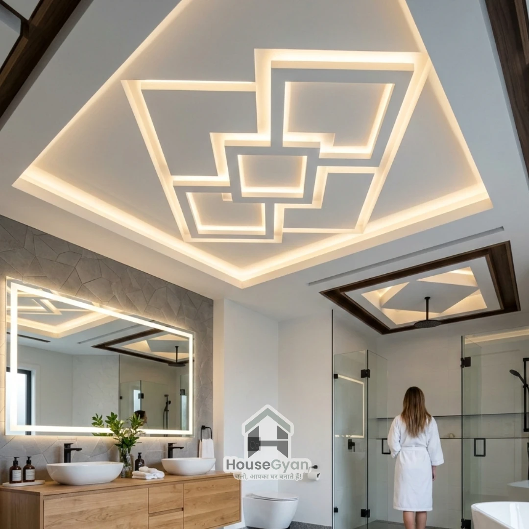 A layered bathroom down ceiling design adds architectural depth to the ceiling. Multiple levels allow designers to incorporate LED lighting, creating a soft glow that improves both the aesthetic appeal and functionality of the bathroom space.