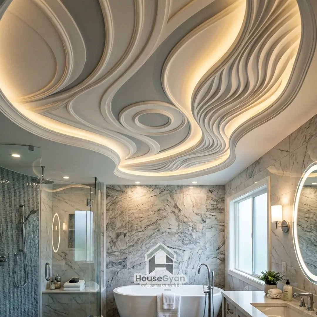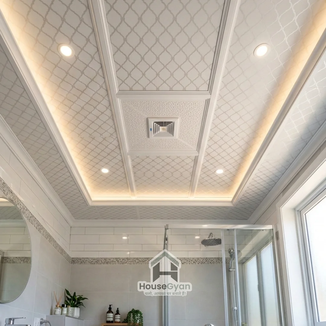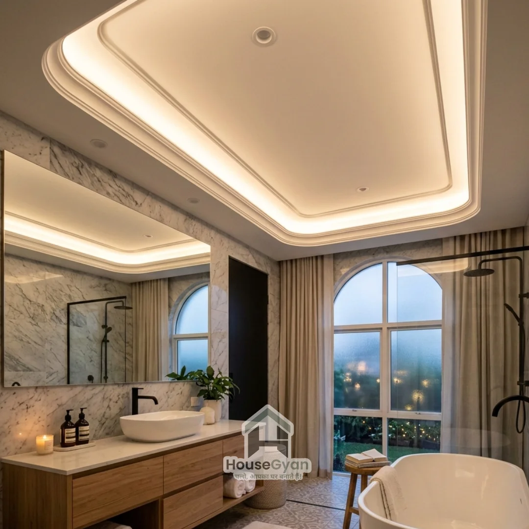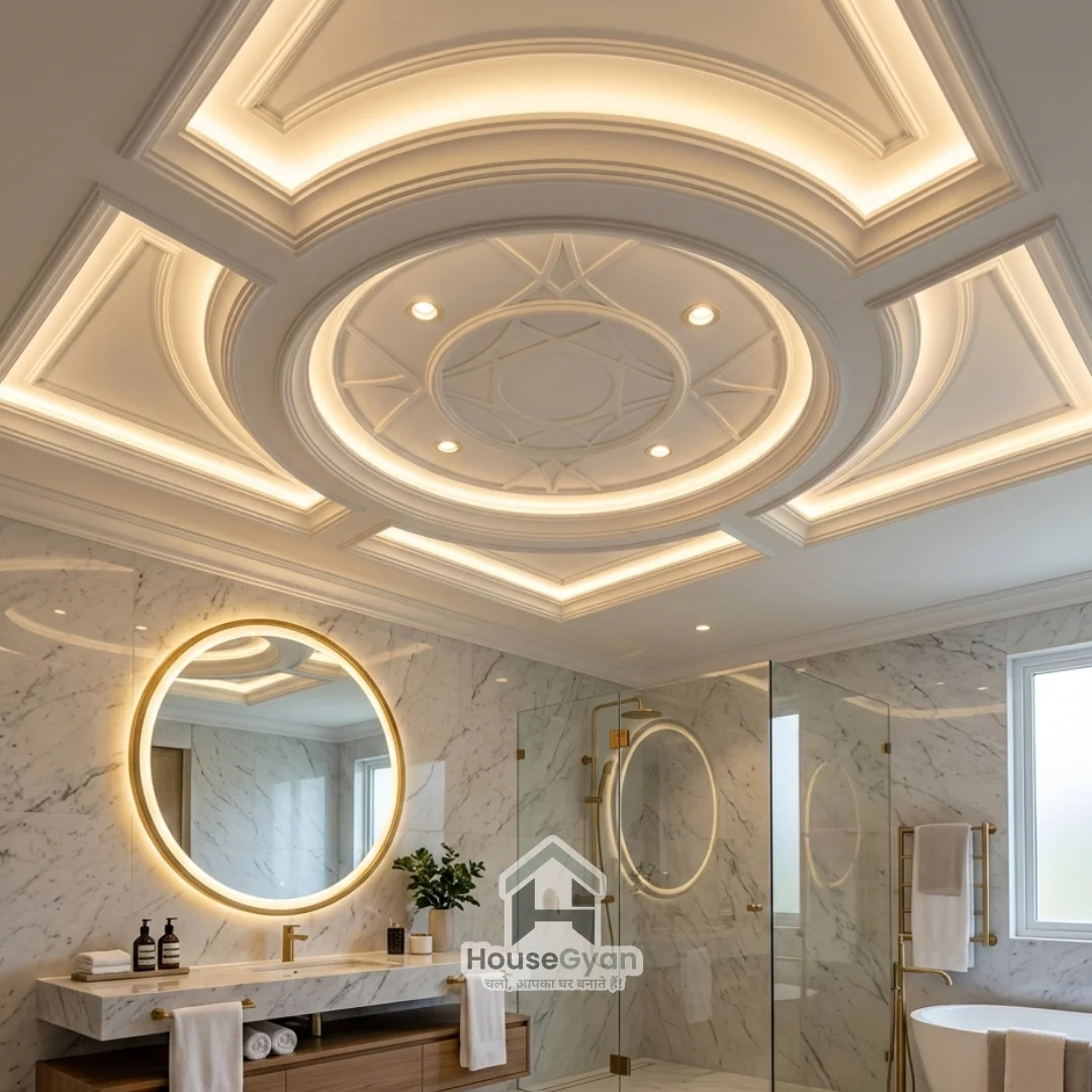 A layered bathroom down ceiling design adds architectural depth to the ceiling. Multiple levels allow designers to incorporate LED lighting, creating a soft glow that improves both the aesthetic appeal and functionality of the bathroom space.