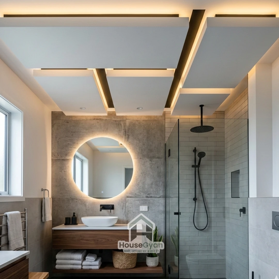 Creative bathroom false ceiling ideas often include geometric patterns such as squares, rectangles, or layered panels. These designs add visual interest to the ceiling and complement contemporary bathroom interiors that focus on modern architecture and stylish simplicity.