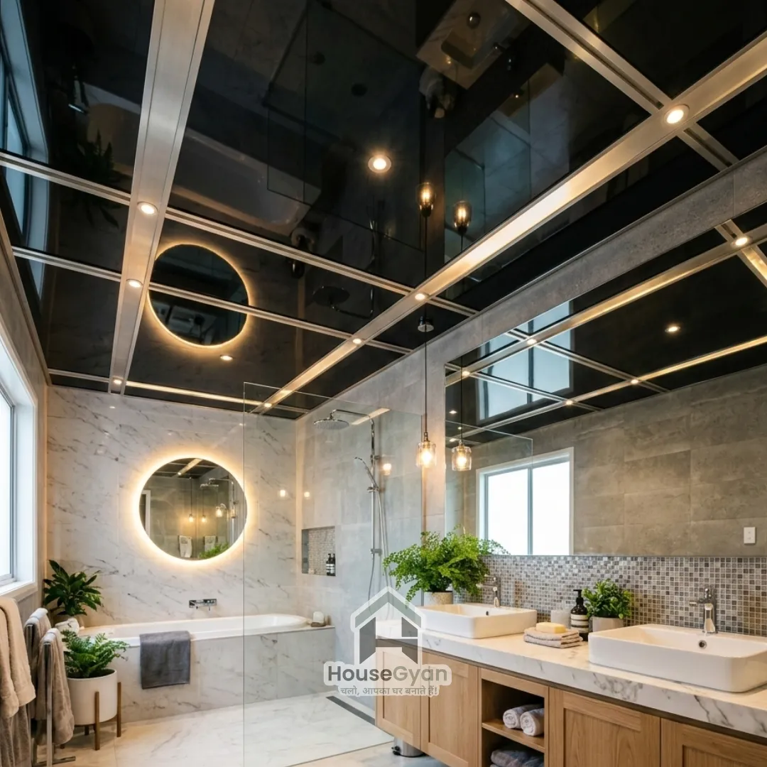 A reflective bathroom false ceiling design with glossy or mirror-like finishes helps distribute light evenly across the bathroom. This design can also create an illusion of height and space, making the bathroom feel larger and more open.