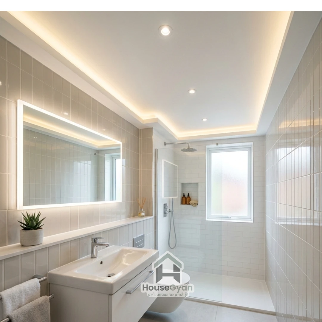 Adding LED strip lights to a modern false ceiling design for bathroom can dramatically improve the ambiance. The hidden lighting creates a glowing effect around the edges of the ceiling and adds a modern touch that enhances the bathroom’s style.