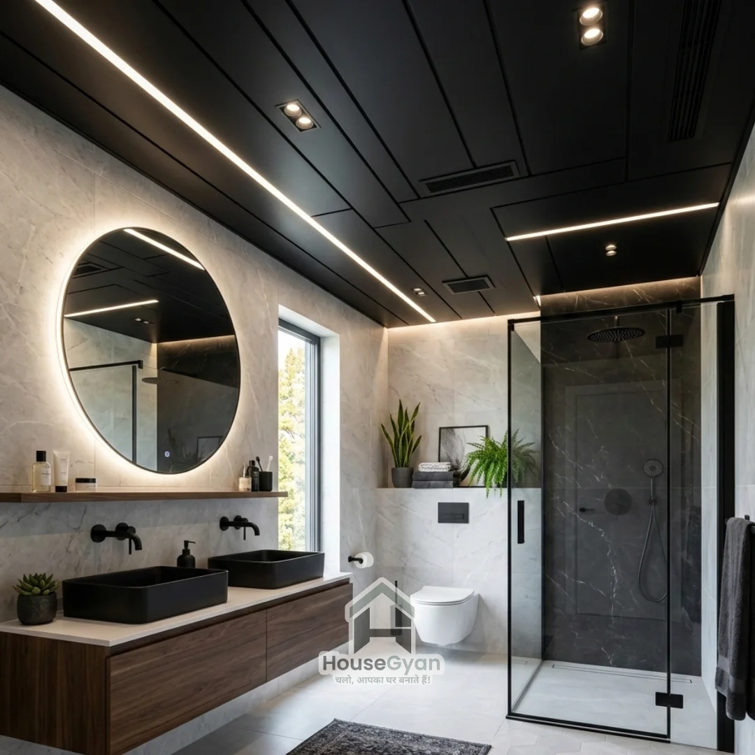 A bold modern false ceiling design for bathroom using matte black panels can create a dramatic and luxurious atmosphere. When paired with lighter walls and modern fixtures, the contrast makes the bathroom look stylish, contemporary, and visually striking.