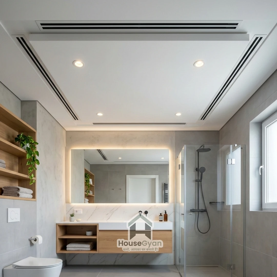 Practical false ceiling ideas for bathroom often include hidden ventilation systems. These designs allow proper airflow while keeping exhaust ducts and wiring concealed, maintaining both functionality and a neat ceiling appearance.