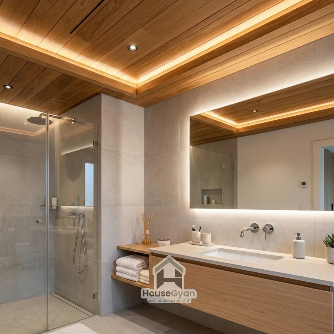 A wooden modern false ceiling design for bathroom brings warmth and a natural spa-like feeling to the space. When paired with hidden LED strip lights and neutral bathroom tiles, wooden ceiling panels create a relaxing environment that feels luxurious and welcoming.