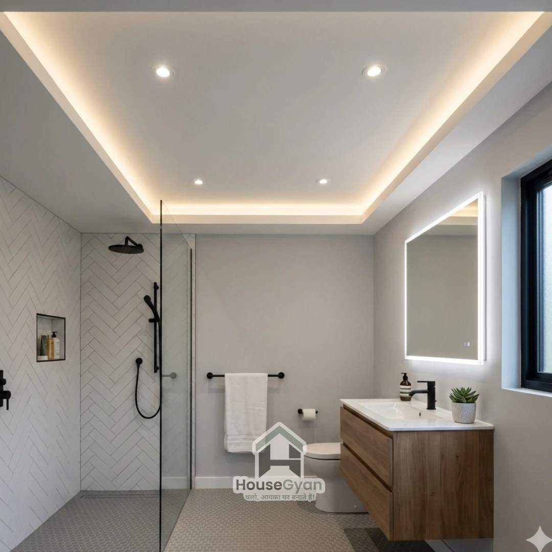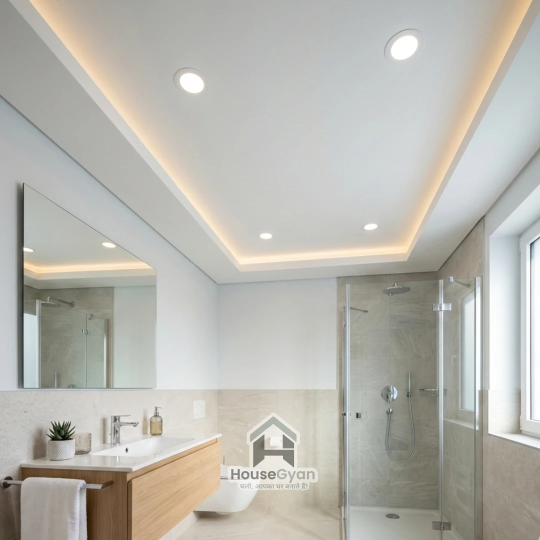 A well-planned small bathroom false ceiling design helps maximize space while maintaining a clean appearance. Using light colors, smooth surfaces, and minimal detailing can visually enlarge the bathroom and prevent the ceiling from making the area feel crowded or cramped.