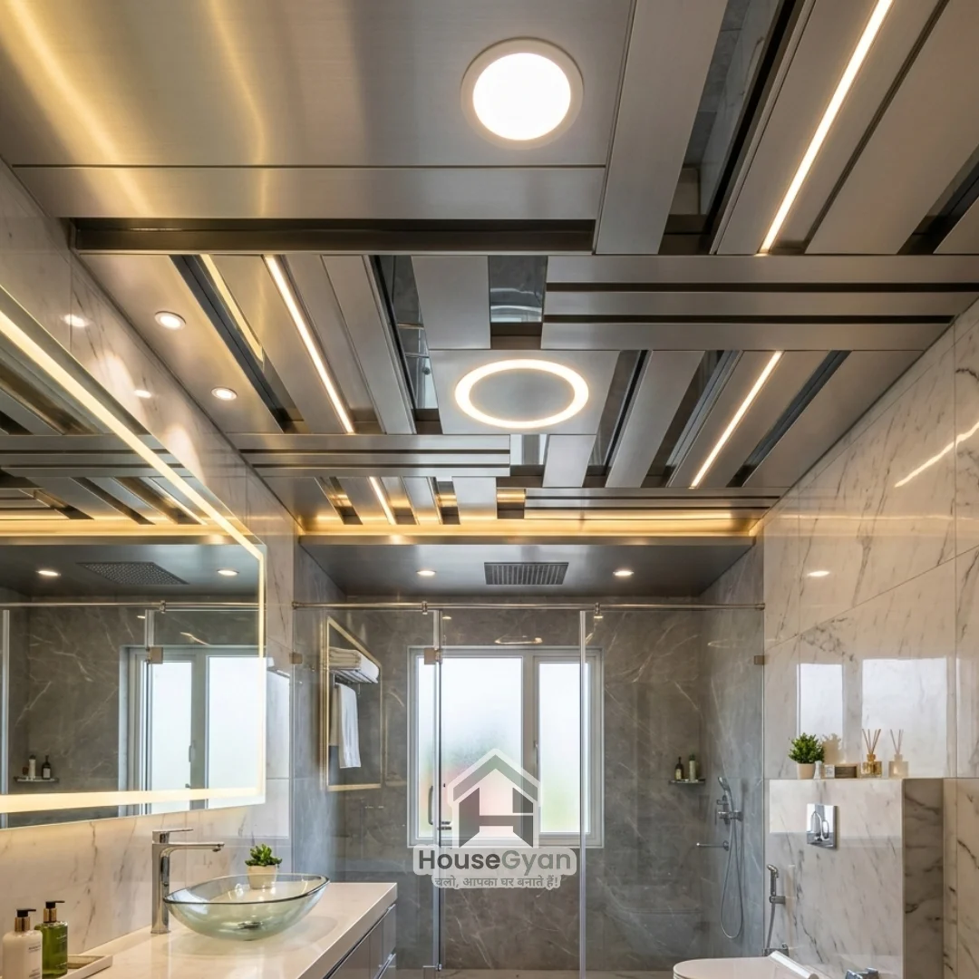 A premium bathroom down ceiling design with metallic finishes like silver or gold can add a luxurious touch to the space. These reflective surfaces enhance lighting and bring a sophisticated modern feel to the bathroom interior.
