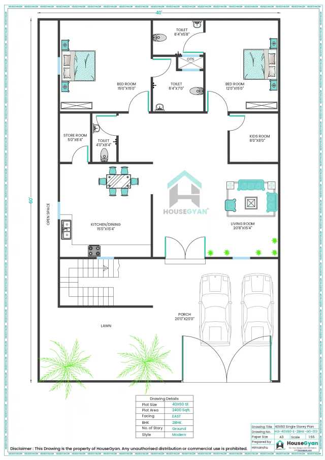 3. 40×60 South Facing 3BHK Ground Floor House Plan – 2400 Sqft Plot