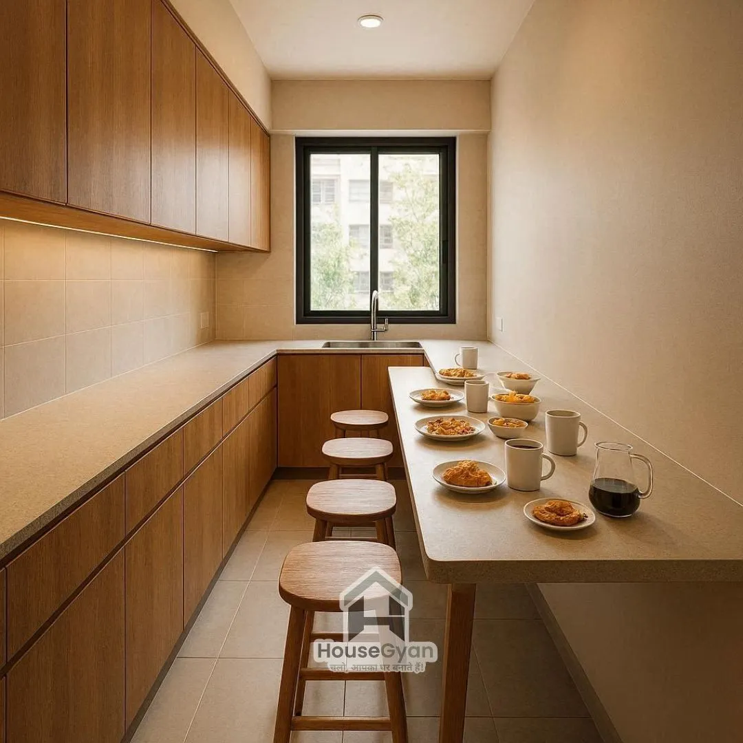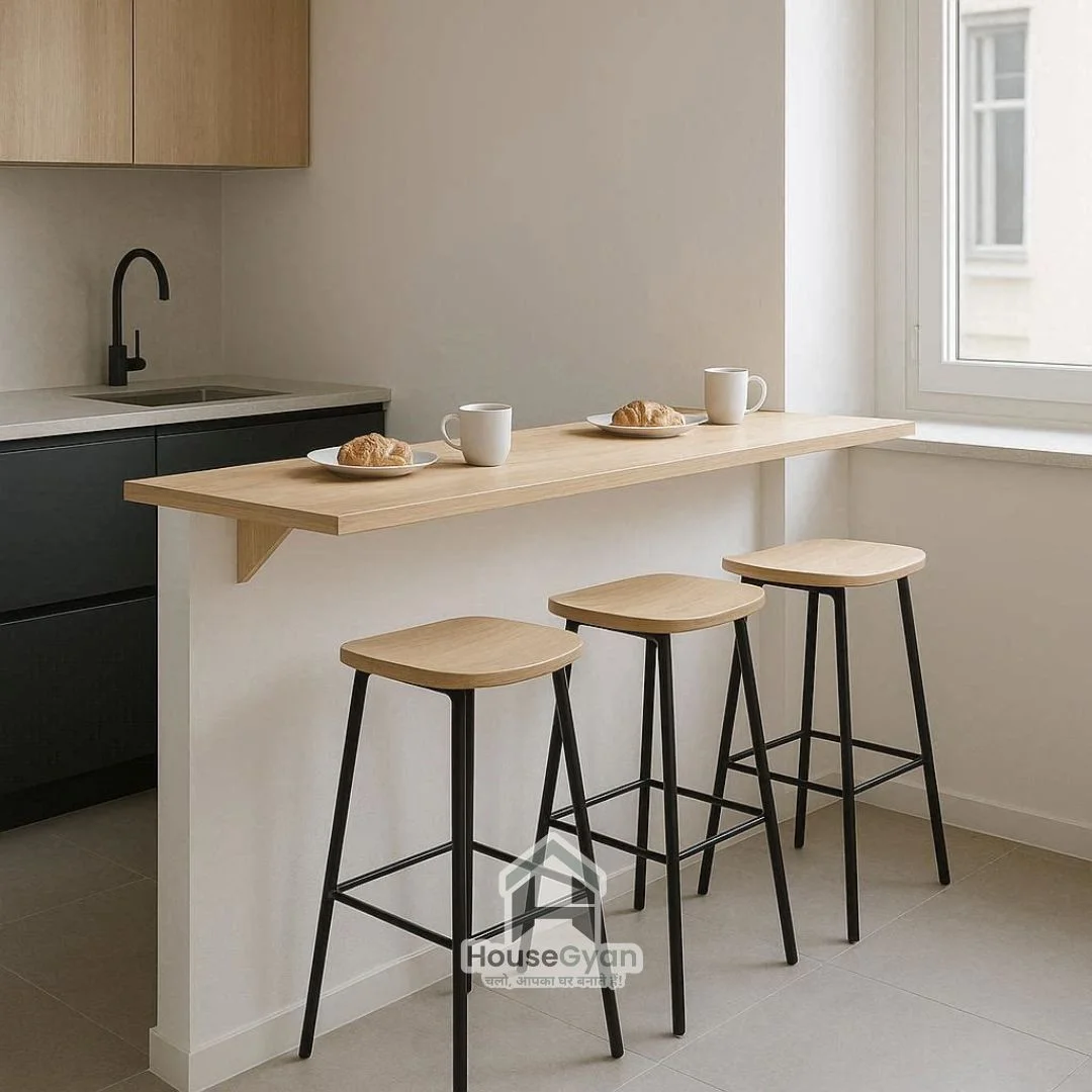 Bar-style dining tables attached to walls are becoming common in modern Indian homes. They double as dining and work surfaces.