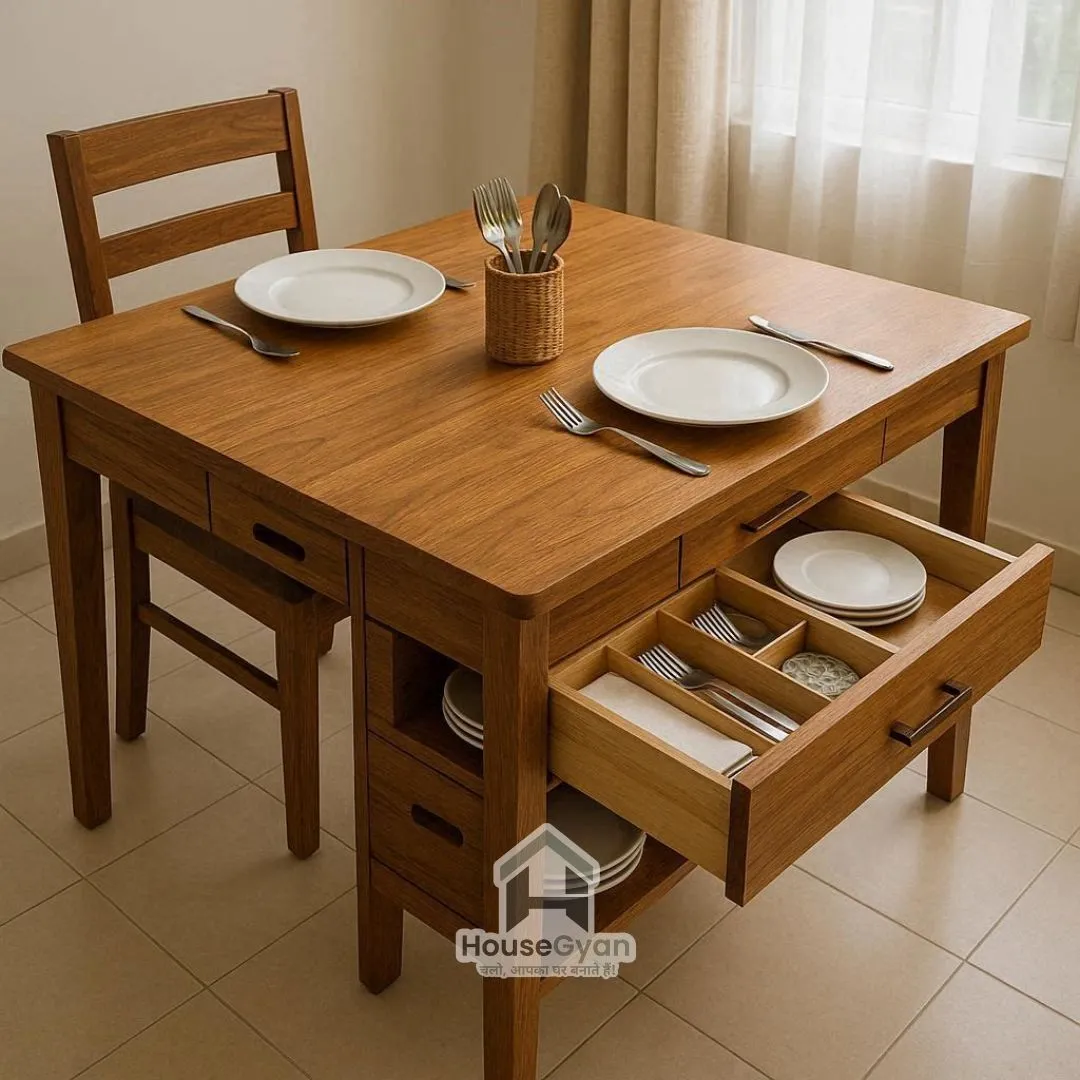 Storage-friendly dining table design ideas for home are highly practical. These tables include drawers or shelves under the tabletop.