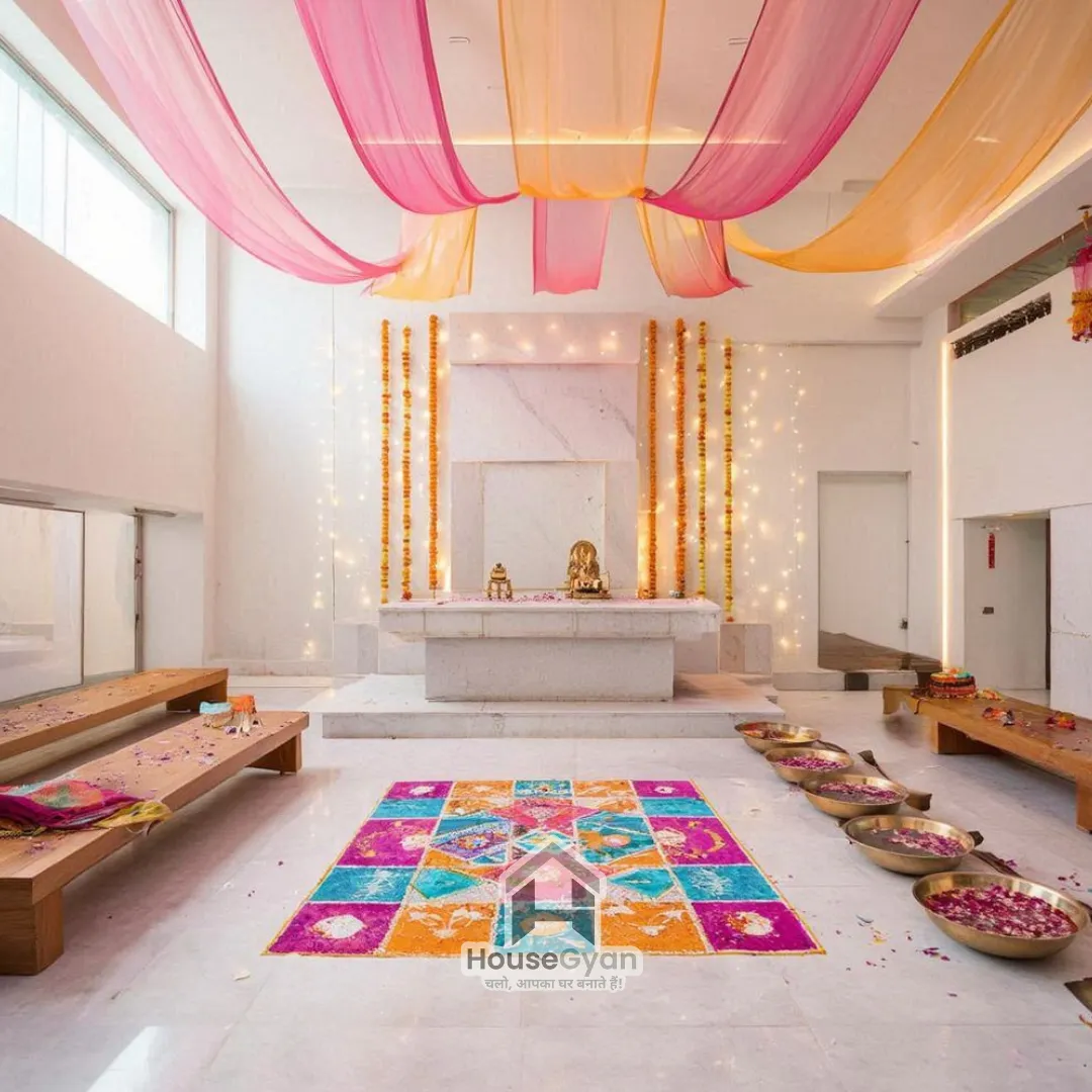 The prayer room is an essential part of Holi celebrations. Decorate it with marigold flowers, colorful diyas, and a simple rangoli. Use vibrant fabrics or scarves to add a festive touch to the space. Simple Holi decoration ideas for the prayer room can create a serene yet celebratory vibe.