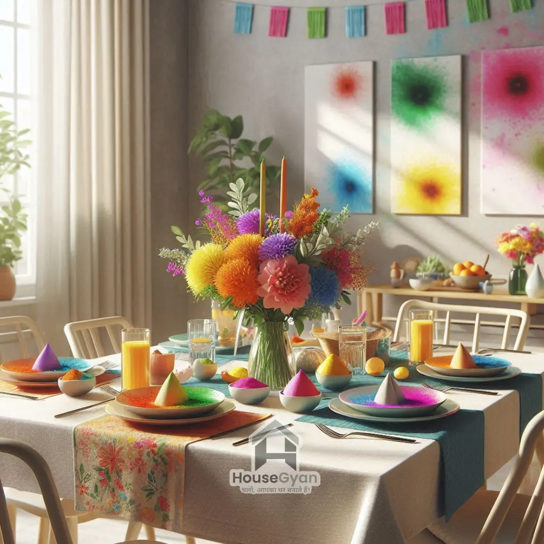 Use colourful table runners, floral centrepieces, and bright crockery to create a festive Holi dining experience.