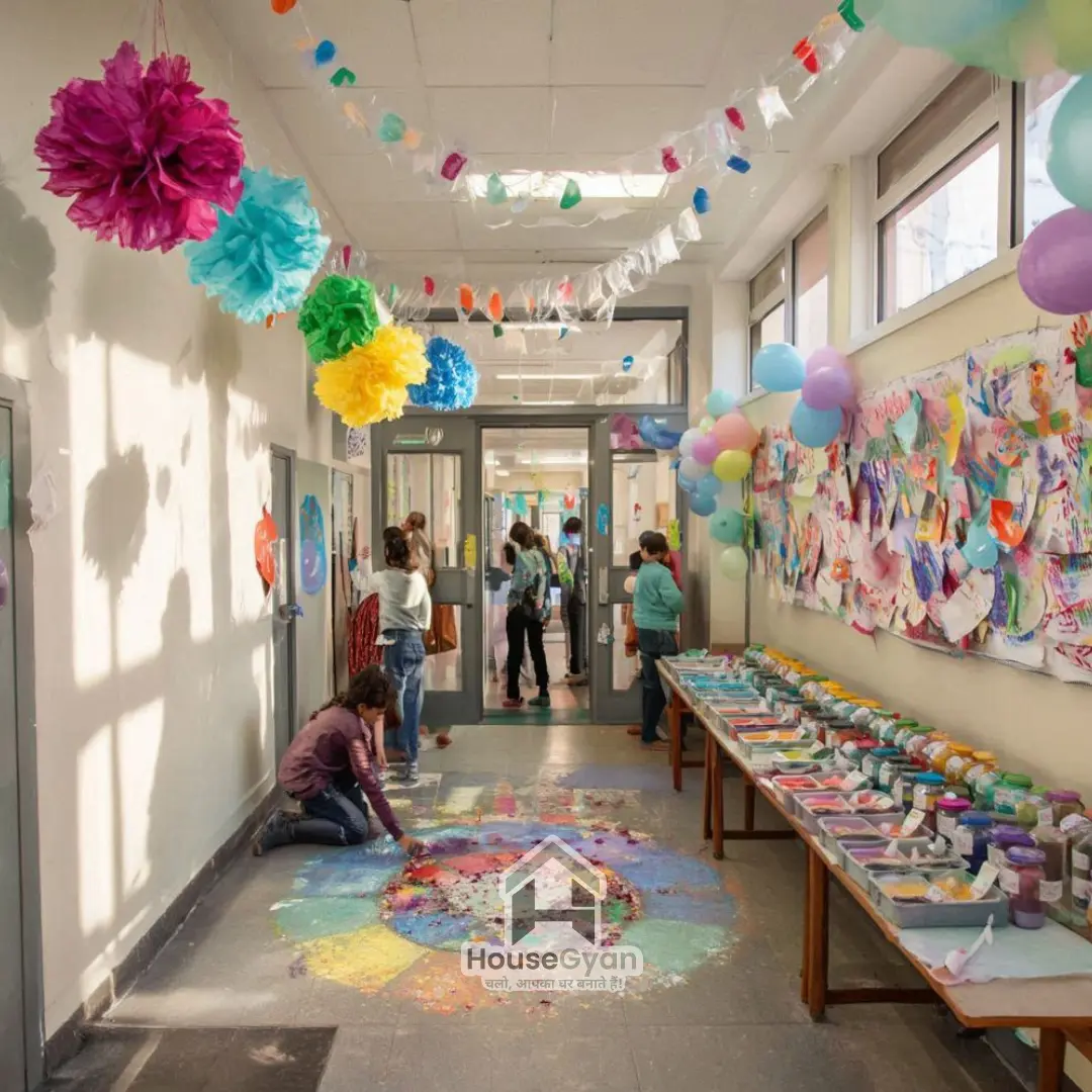 Decorate classrooms with paper flowers, colour splashes, and student-made crafts to celebrate Holi joyfully and safely.