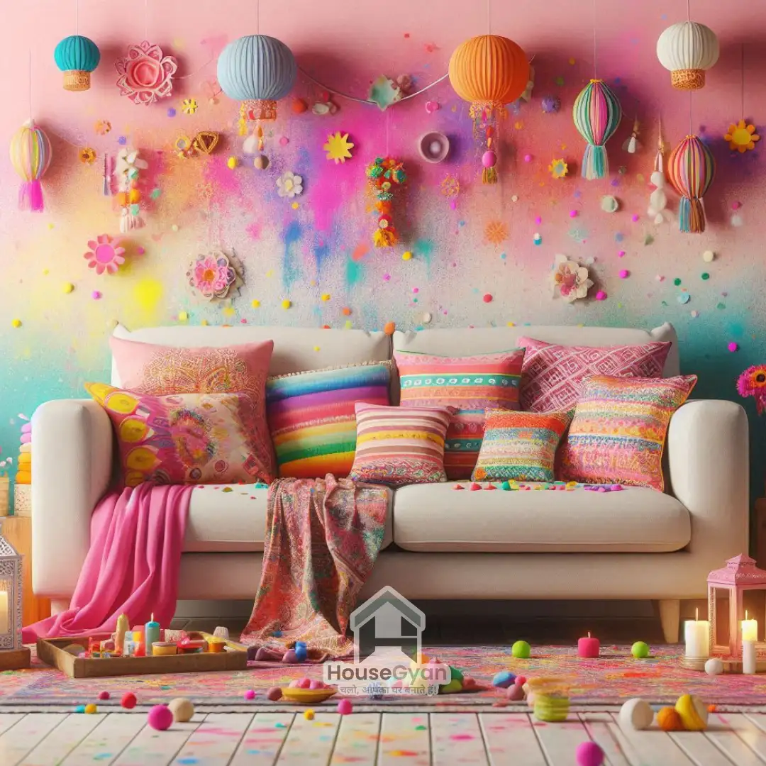 Bright sofa covers, colourful cushions, and festive throws add instant Holi vibes to your living room seating.