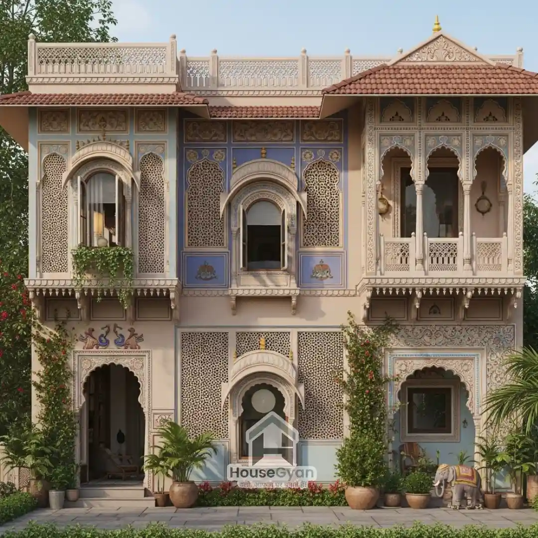 Traditional Indian Exteriors: Sloped roofs, arches, and natural materials like stone or brick.