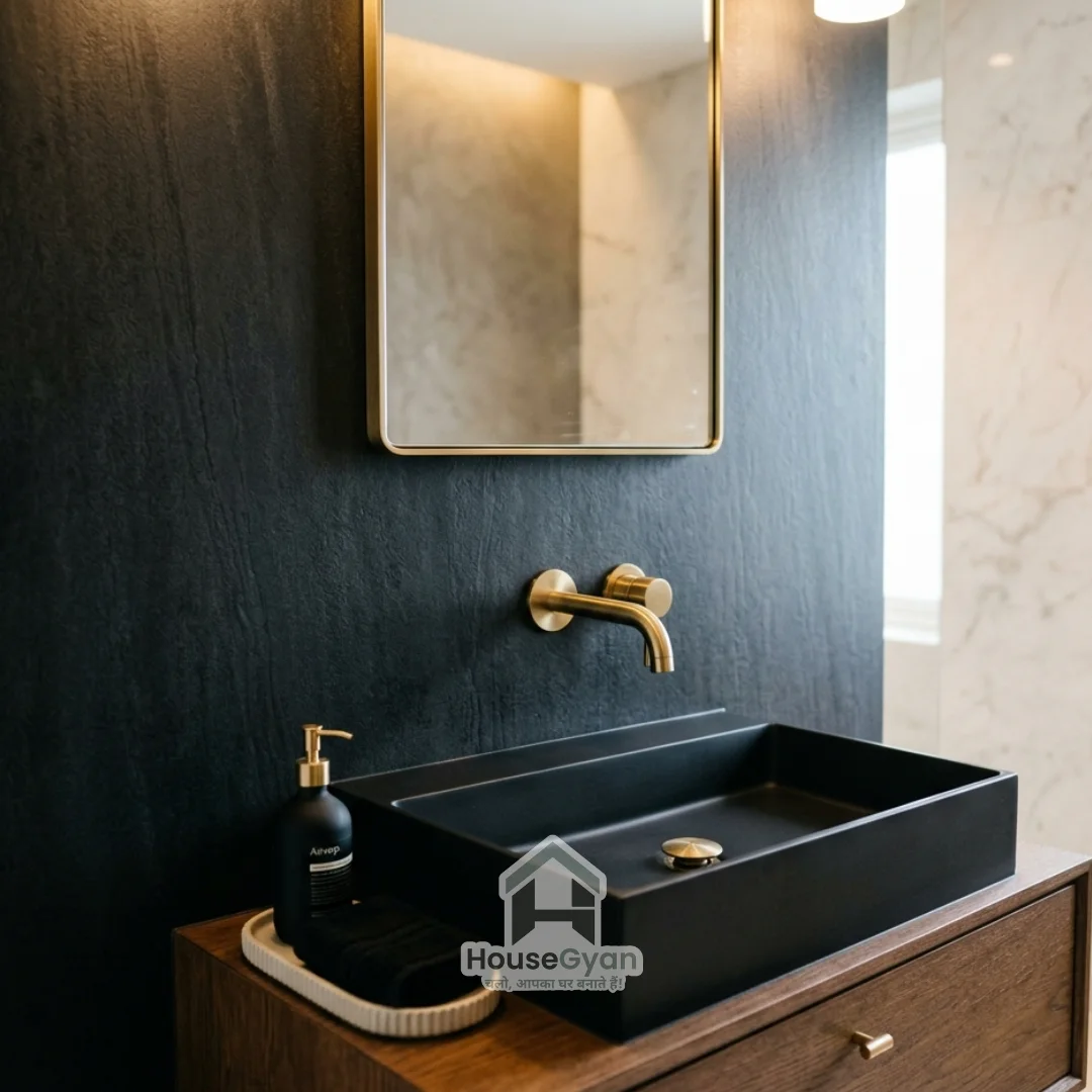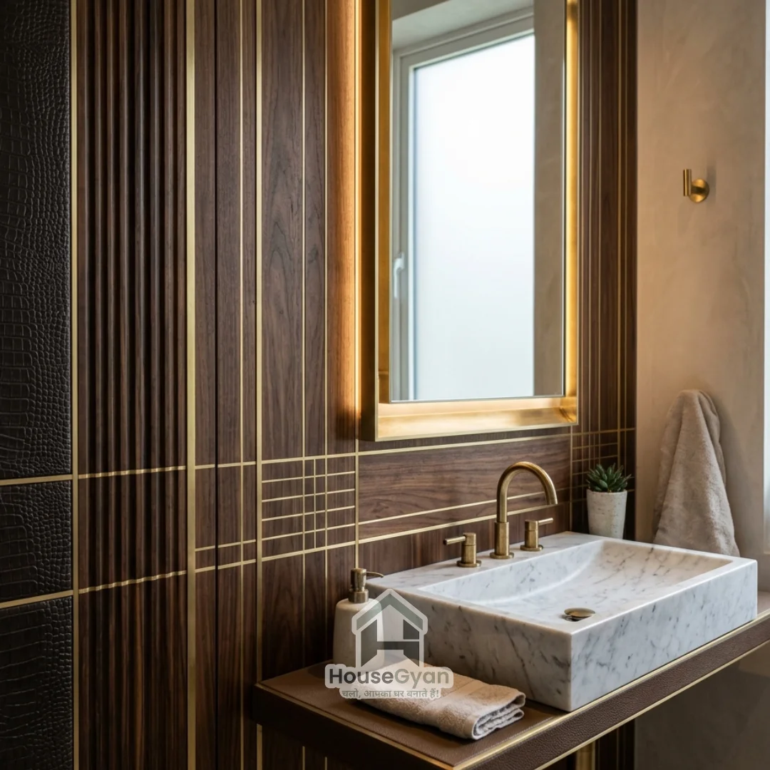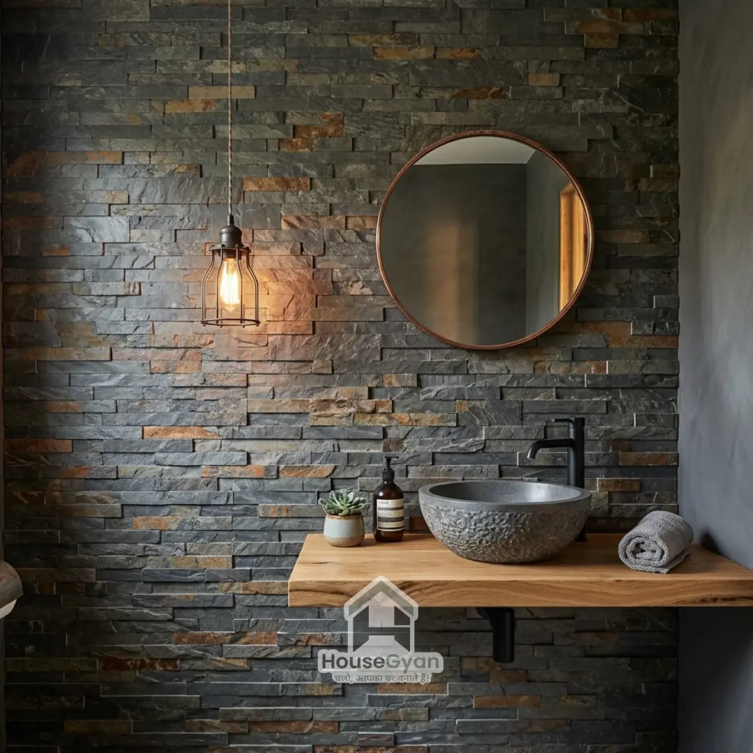 For a rustic or industrial feel, use thin slate or sandstone cladding. This wash basin wall panel design adds incredible tactile texture and works wonders in powder rooms that need a bit of "edge."