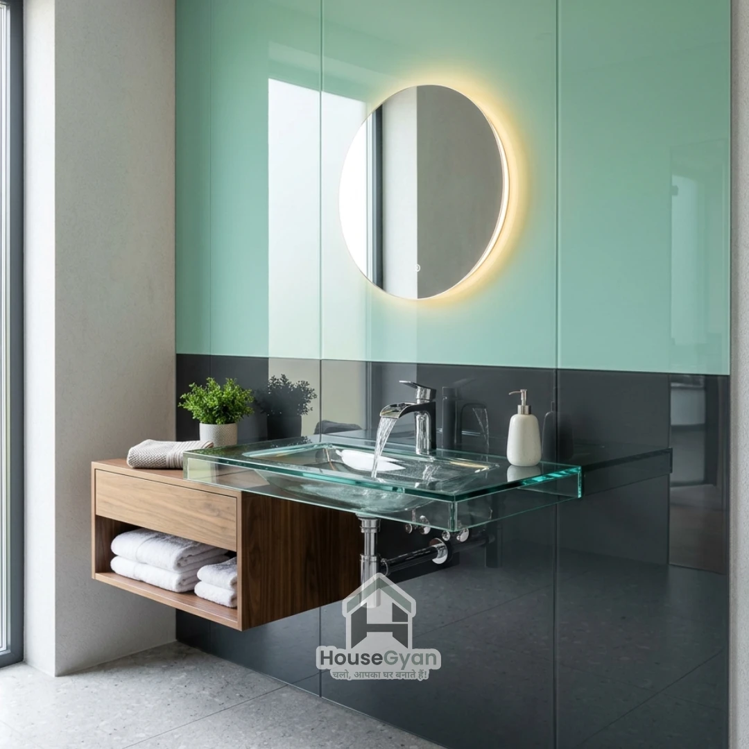 Back-painted glass panels in shades like mint green or deep charcoal are gaining massive popularity. They are one of the most wonderful modern bathroom basin ideas, which are completely waterproof and reflect ample light.