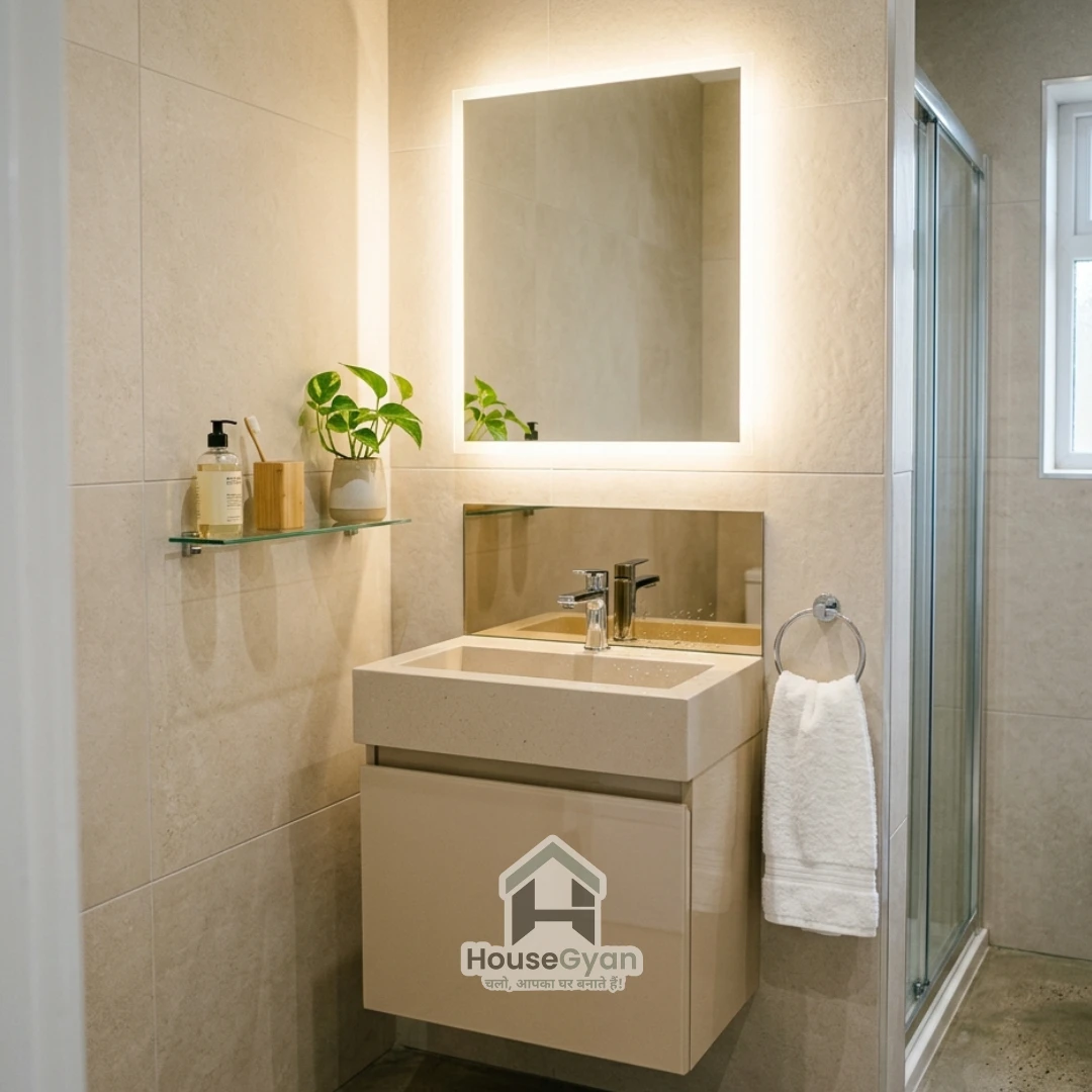 For closed spaces, a modern wash basin panel design for a small bathroom uses light-colored, reflective materials like mirrored glass or light beige quartz to keep the area from feeling larger.