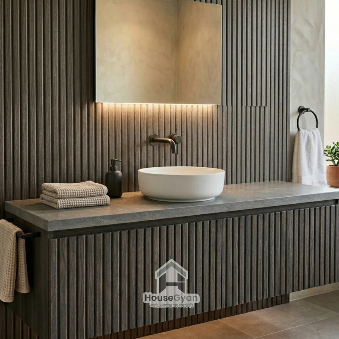 To bring warmth to a cold bathroom, go for moisture-resistant charcoal or fluted wood panels. This wash basin design pairs beautifully with white ceramic bowls, offering a cosy, organic, and spa-like atmosphere.