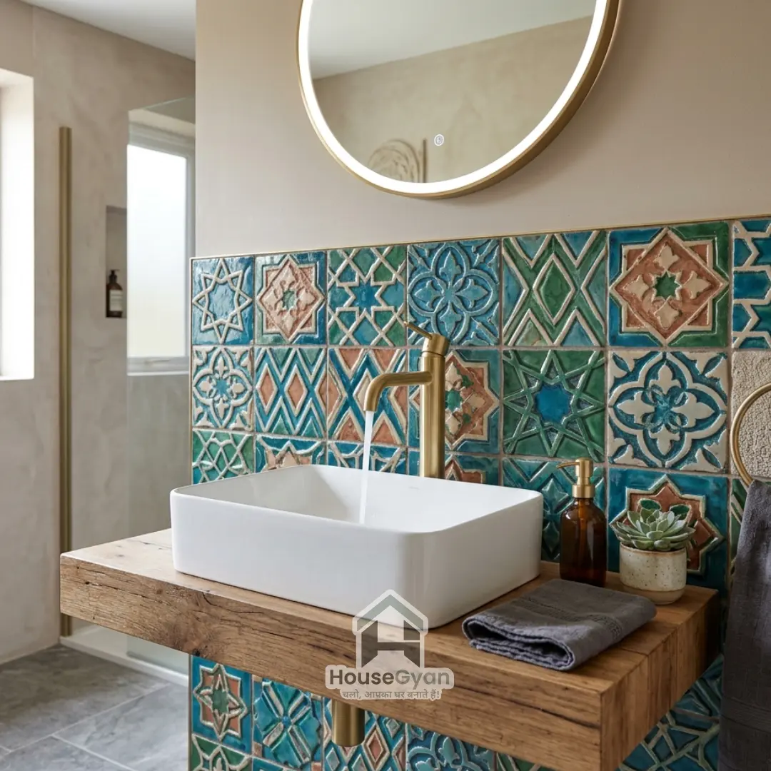 Moroccan-inspired 3D geometric tiles or patterns can provide a stunning backdrop for a wash basin design. These tiles give your basin area depth, so it doesn't look flat or dull.