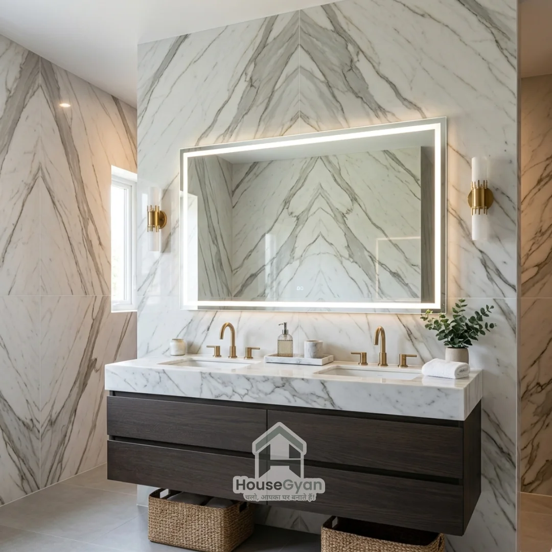Marble remains the king of luxury wash basin panel designs for home. A full-height Italian marble or high-quality porcelain slab with continuous veining creates a seamless, high-end "monolithic" look that feels timeless.