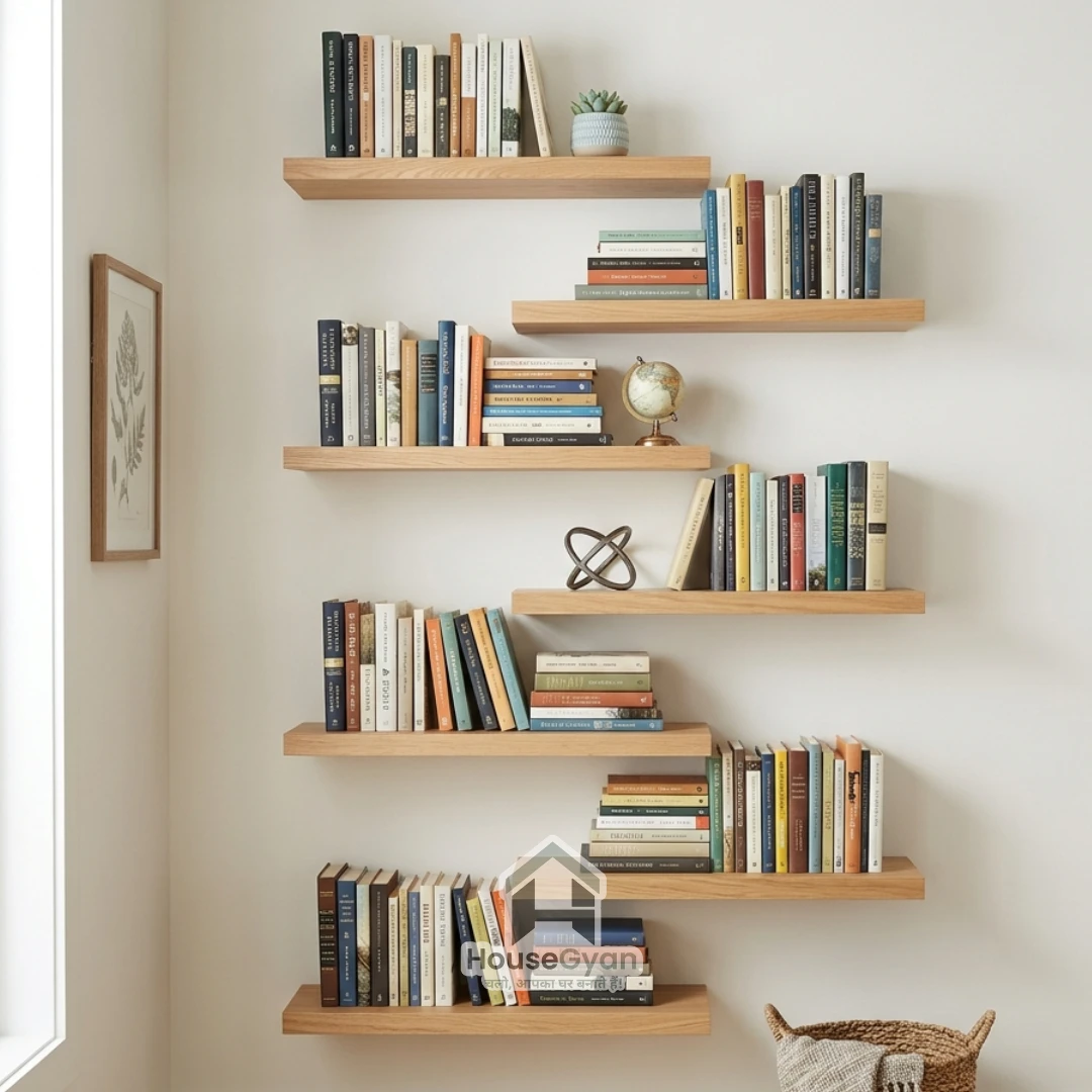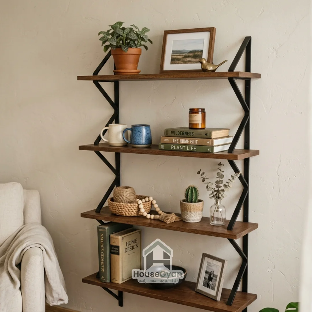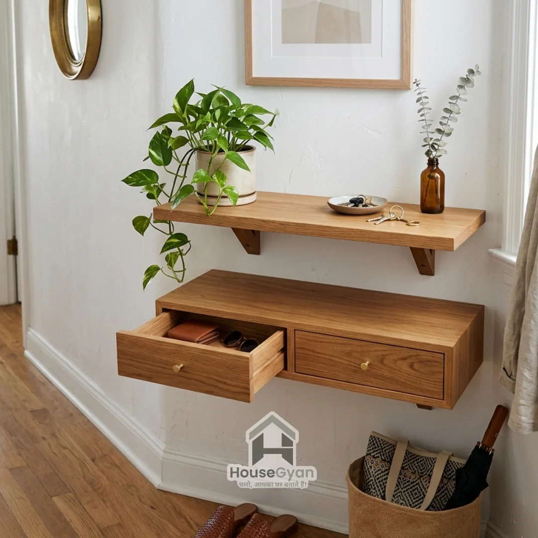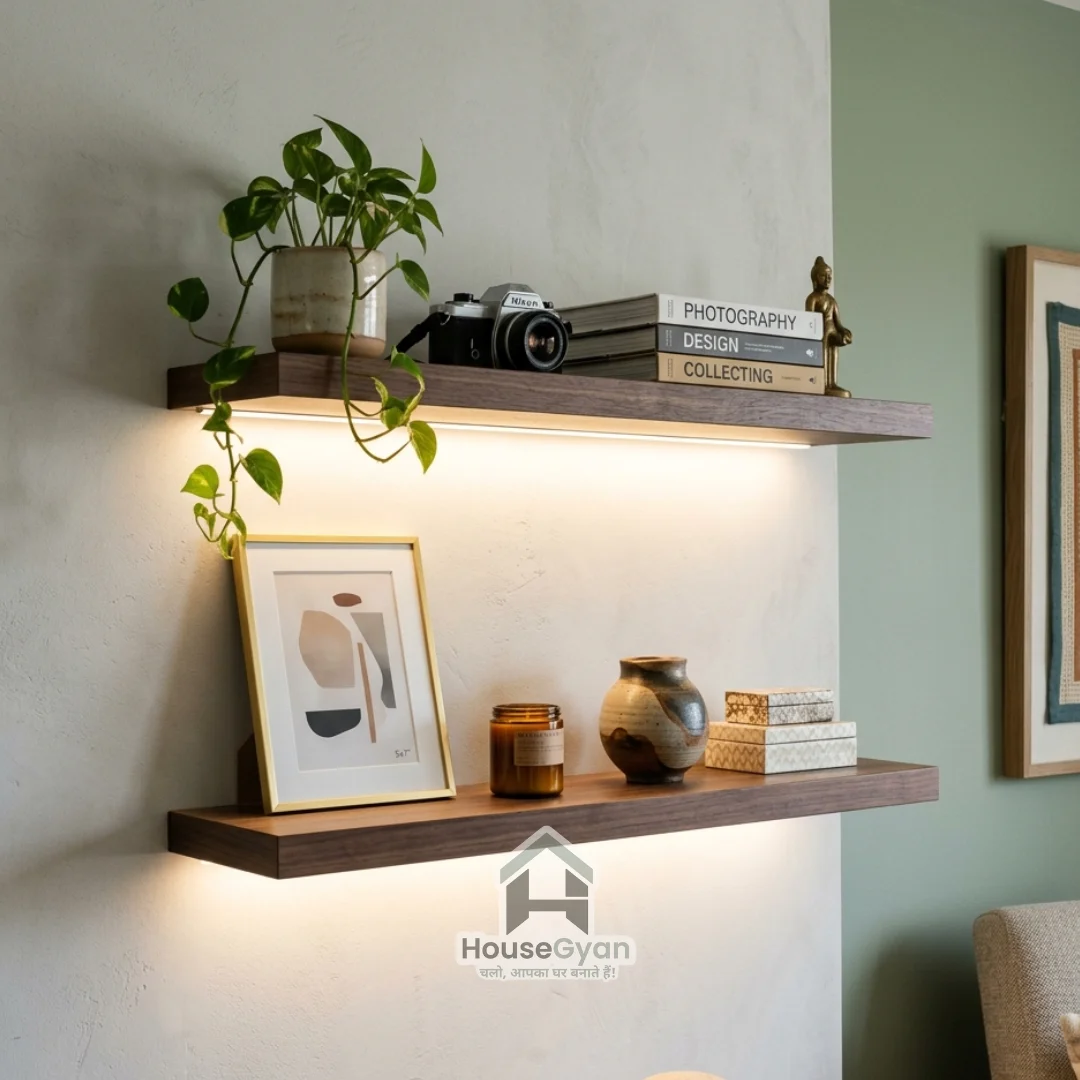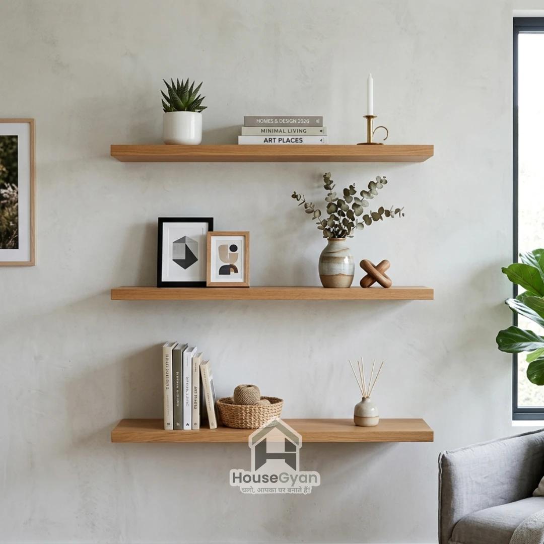 A classic, simple floating shelf design for Indian homesthat adds warmth and natural texture to any modern living room.