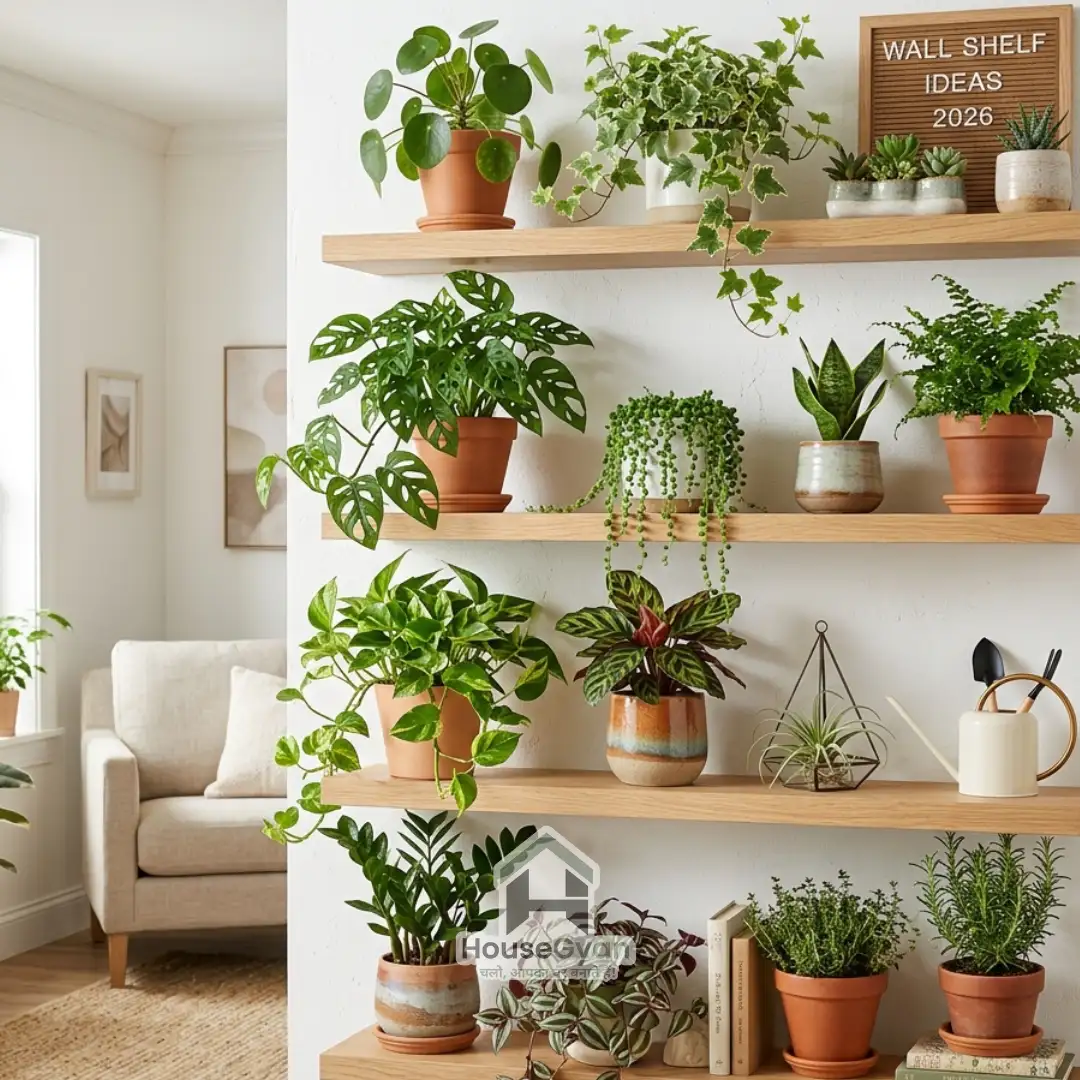 Give your greenery a boost with these wall shelf ideas 2026, creating a "living wall" effect that stays organised.