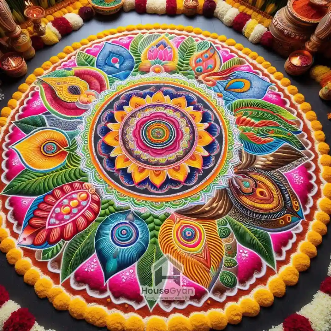 Peacocks are a symbol of beauty and elegance, making them a popular choice for peacock rangoli designs for Pongal. Use bright colors like blue, green, and gold to craft stunning peacock patterns that stand out as the centerpiece of your home’s decorations.