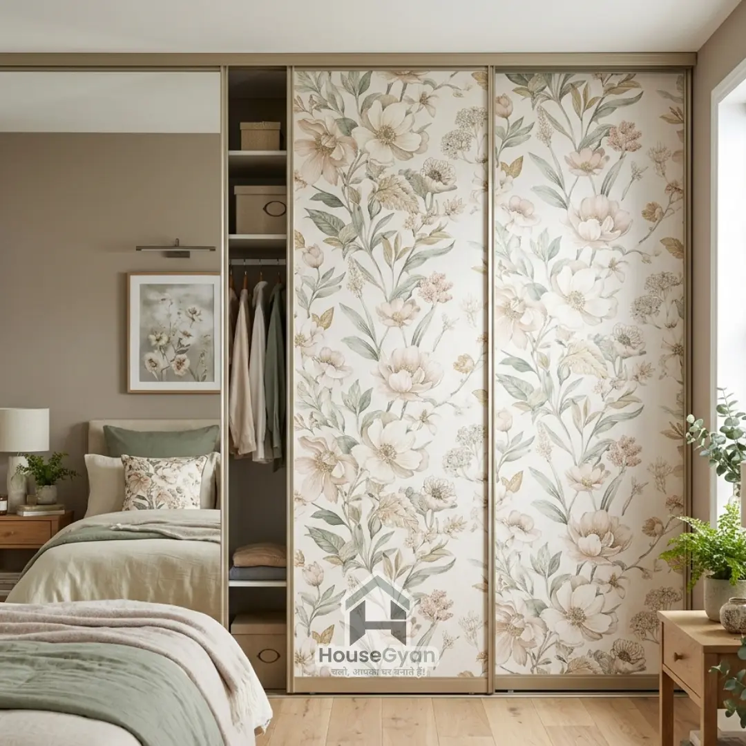 Floral prints add a soft and elegant touch to bedroom interiors. These designs usually feature flowers, leaves, or botanical patterns printed on glass or laminated panels. Floral prints are perfect for creating a calm and decorative bedroom atmosphere.