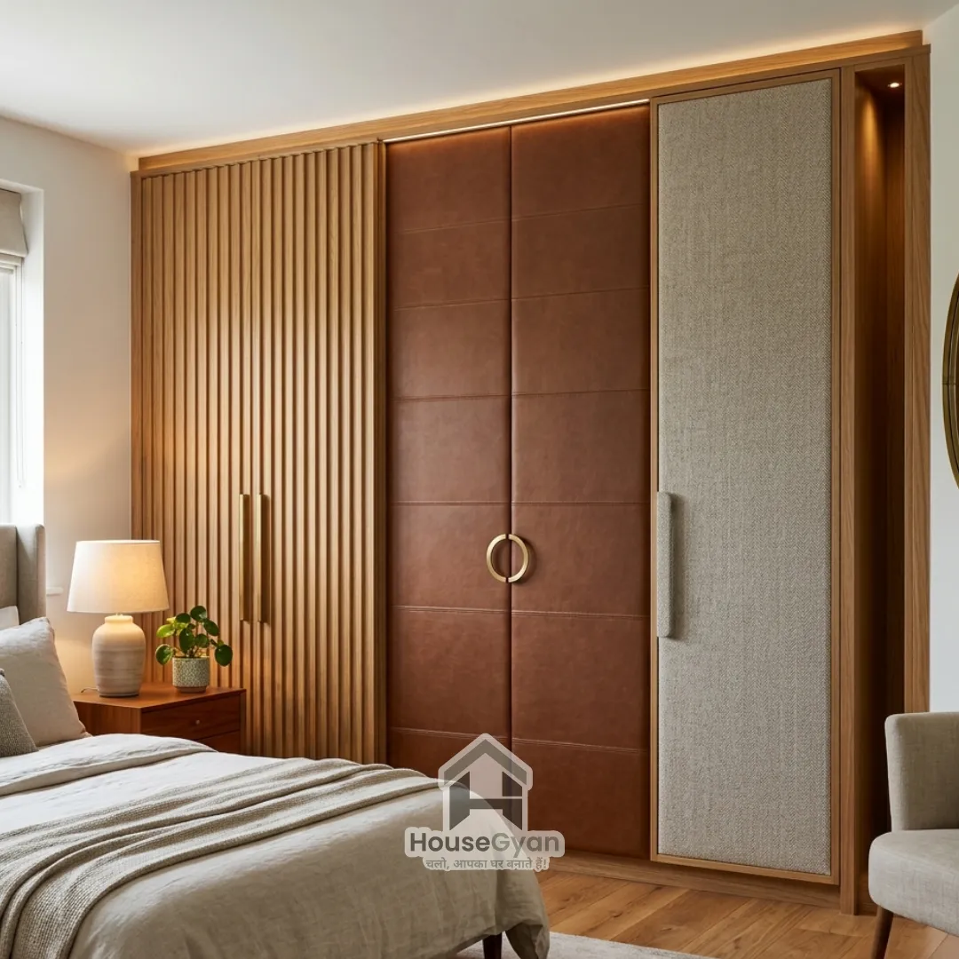 Textured wardrobes use materials like fluted wood, leather laminates, or fabric panels to create depth and character. This latest wardrobe design trend adds a unique decorative element to the bedroom. Textured finishes work well with modern wardrobe door design ideas.