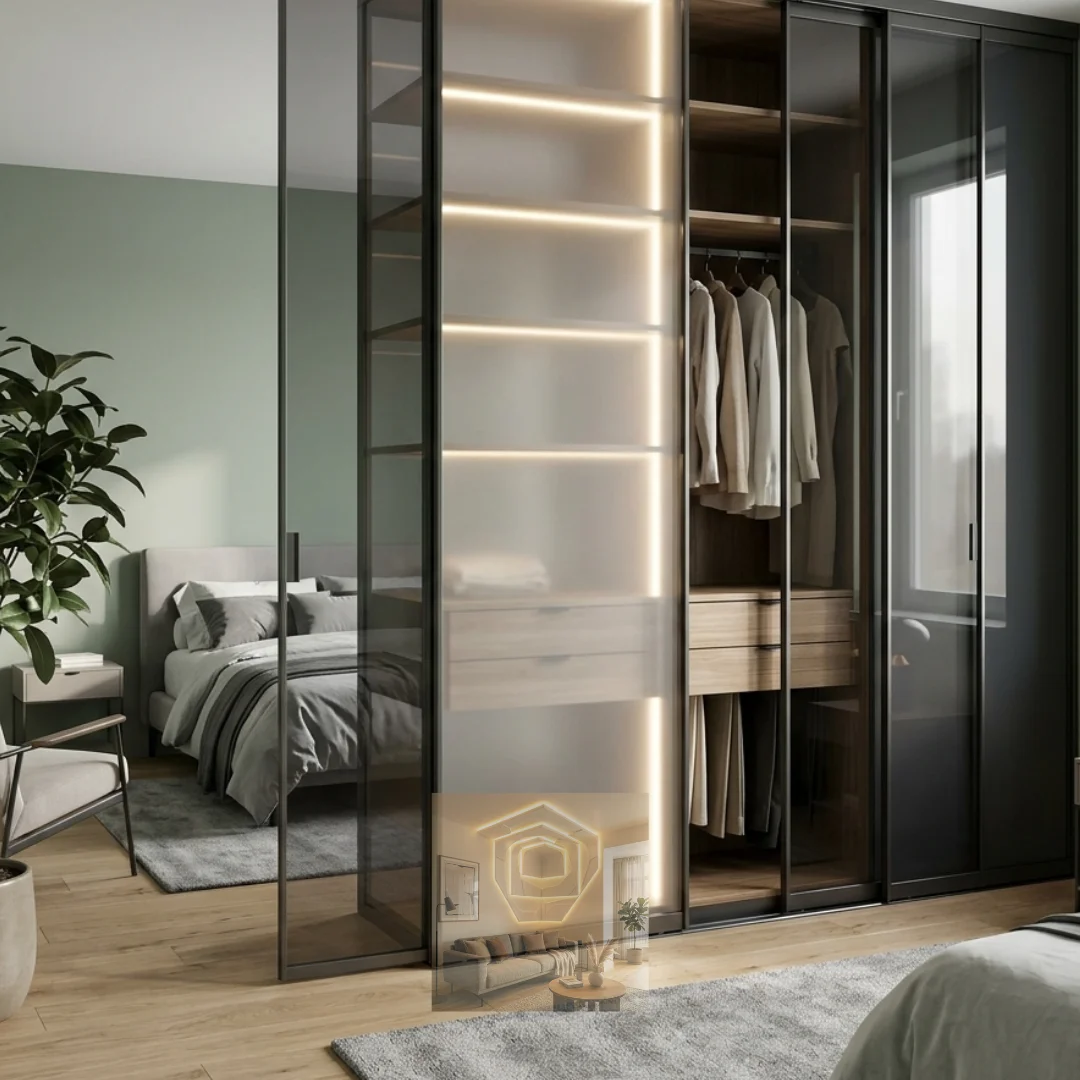 Glass wardrobes are becoming part of the latest wardrobe design trends due to their modern and sophisticated appearance. Frosted, tinted, or lacquered glass doors give wardrobes a luxurious finish. These wardrobe door design ideas are perfect for modern bedrooms that aim for a clean and minimal aesthetic.