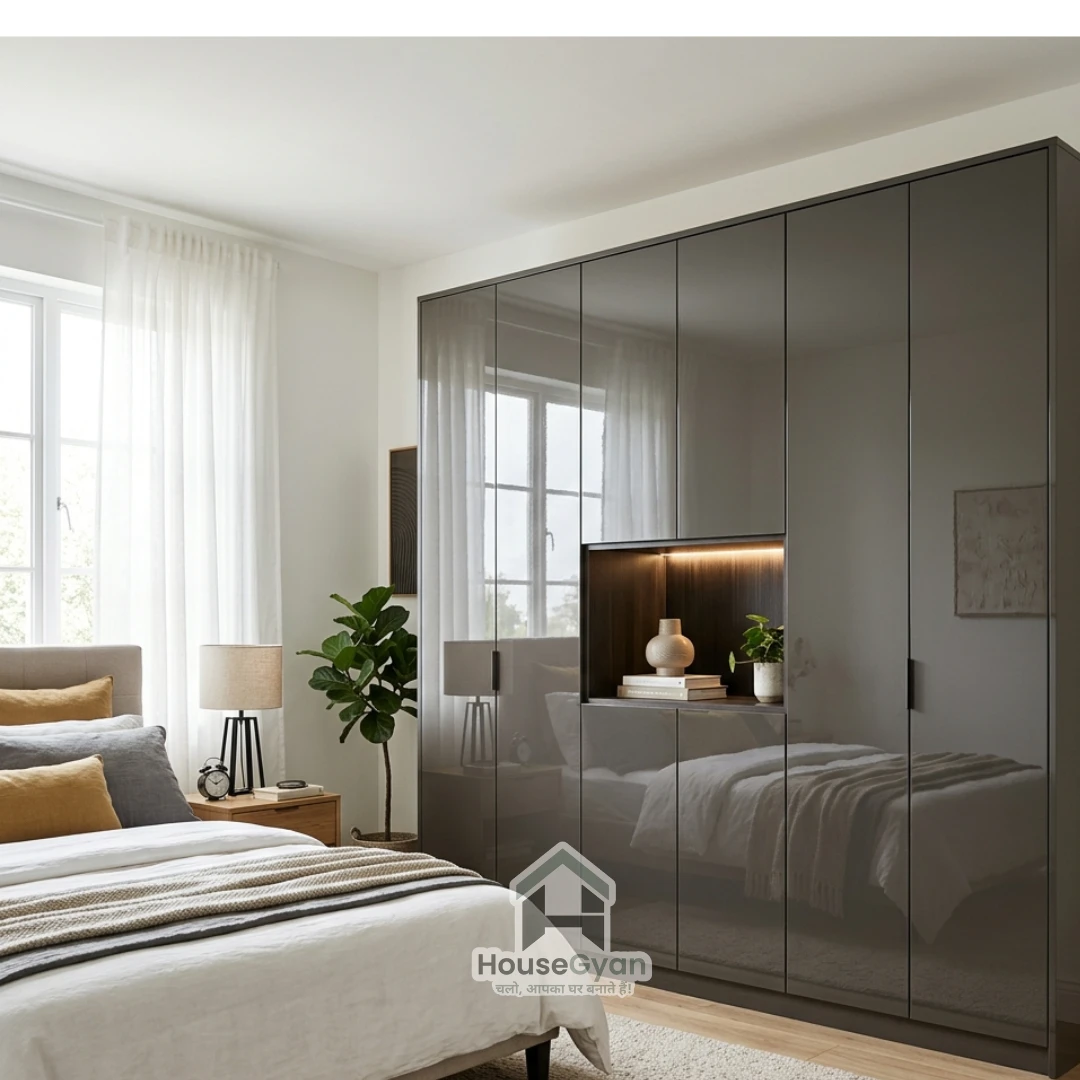 Glossy wardrobes bring brightness and sophistication to bedroom interiors. High-gloss laminates or acrylic finishes reflect light, making the space appear larger and more vibrant. This stylish wardrobe design is especially popular in contemporary homes that prefer bold and modern interior aesthetics.