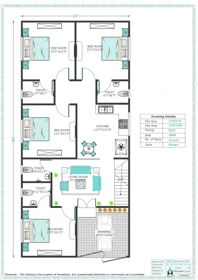 9. 23×50 East Facing 4BHK Ground Floor House Plan (1150 Sq Ft)