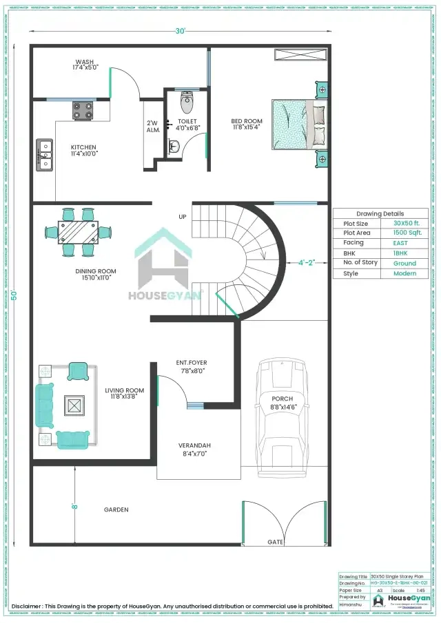 The 30×50 east facing 1BHK plan offers a spacious layout with the possibility of future expansion.