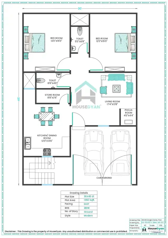 - 3. 30×45 East Facing 2BHK Ground Floor House Plan (1350 Sq Ft)