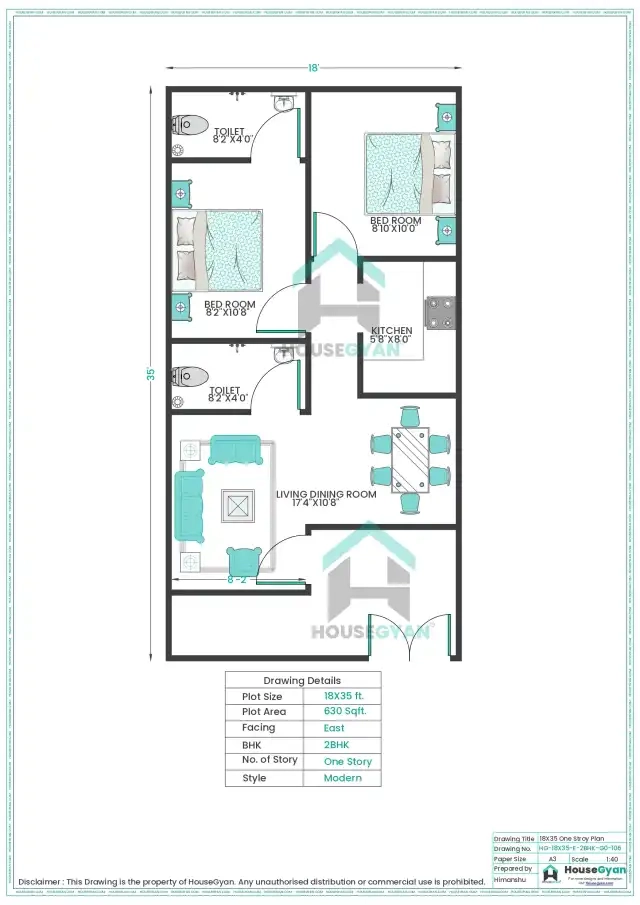 1. 18×35 East Facing 2BHK Ground Floor House Plan (630 Sq Ft)