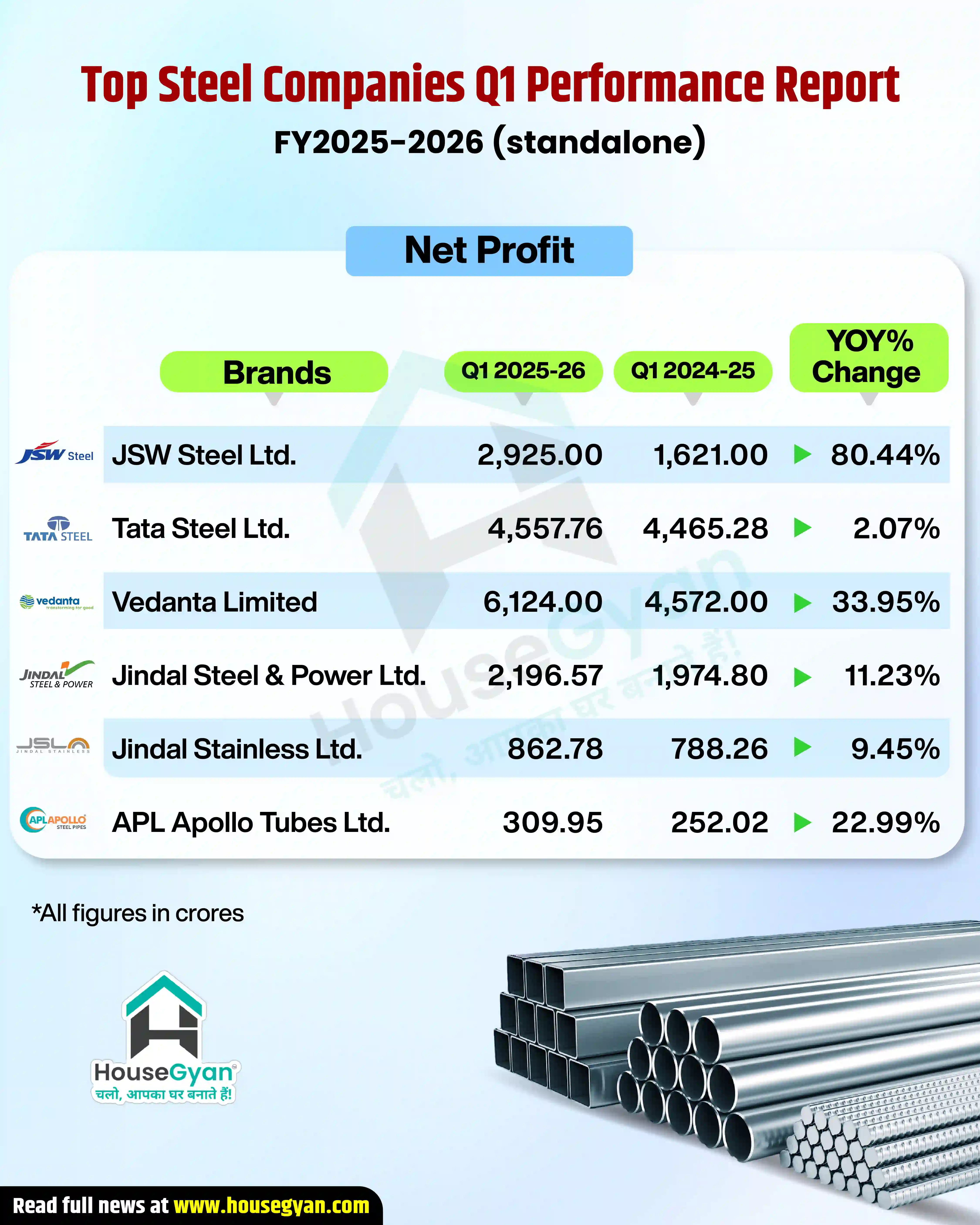 APL Apollo reported 3.93% revenue growth (₹5,169 Cr.) and a 22.99% profit jump to ₹309 Cr., highlighting demand for structural steel tubes in housing and infra projects.
