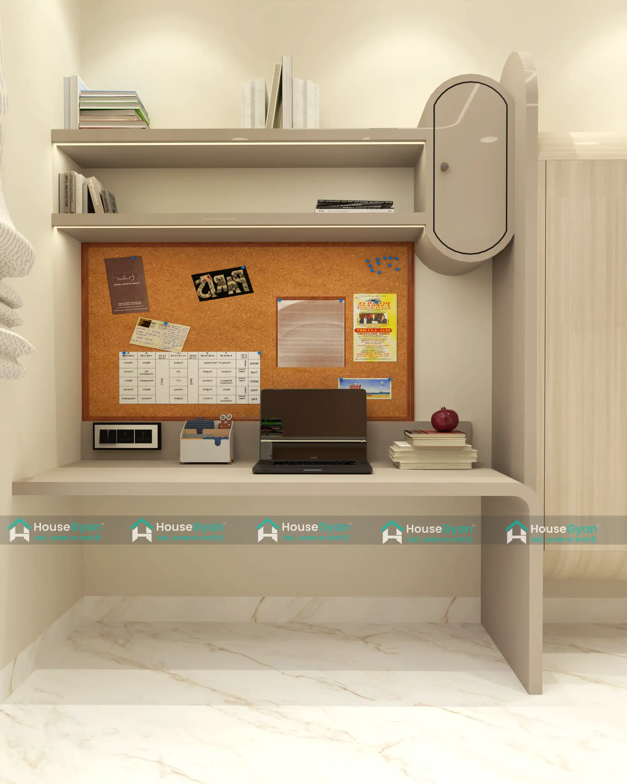 This premium study table design stands out with its artistic circular leg detailing, giving the furniture a soft, sculptural elegance while maintaining strong structural balance. The seamless white worktop paired with vertical fluted wooden panels creates a warm yet minimal aesthetic, perfect for contemporary and luxury interiors. The design includes thoughtfully planned wall-mounted open shelves for books and décor, a functional cork board for notes and schedules, and a compact drawer unit for organized storage. Ambient lighting and a neutral cream–wood palette enhance visual comfort, making the space ideal for long study or work hours. Overall, this study table setup offers a perfect blend of modern design, ergonomic comfort, and smart storage—making it an excellent choice for stylish home offices, bedrooms, or dedicated study corners.