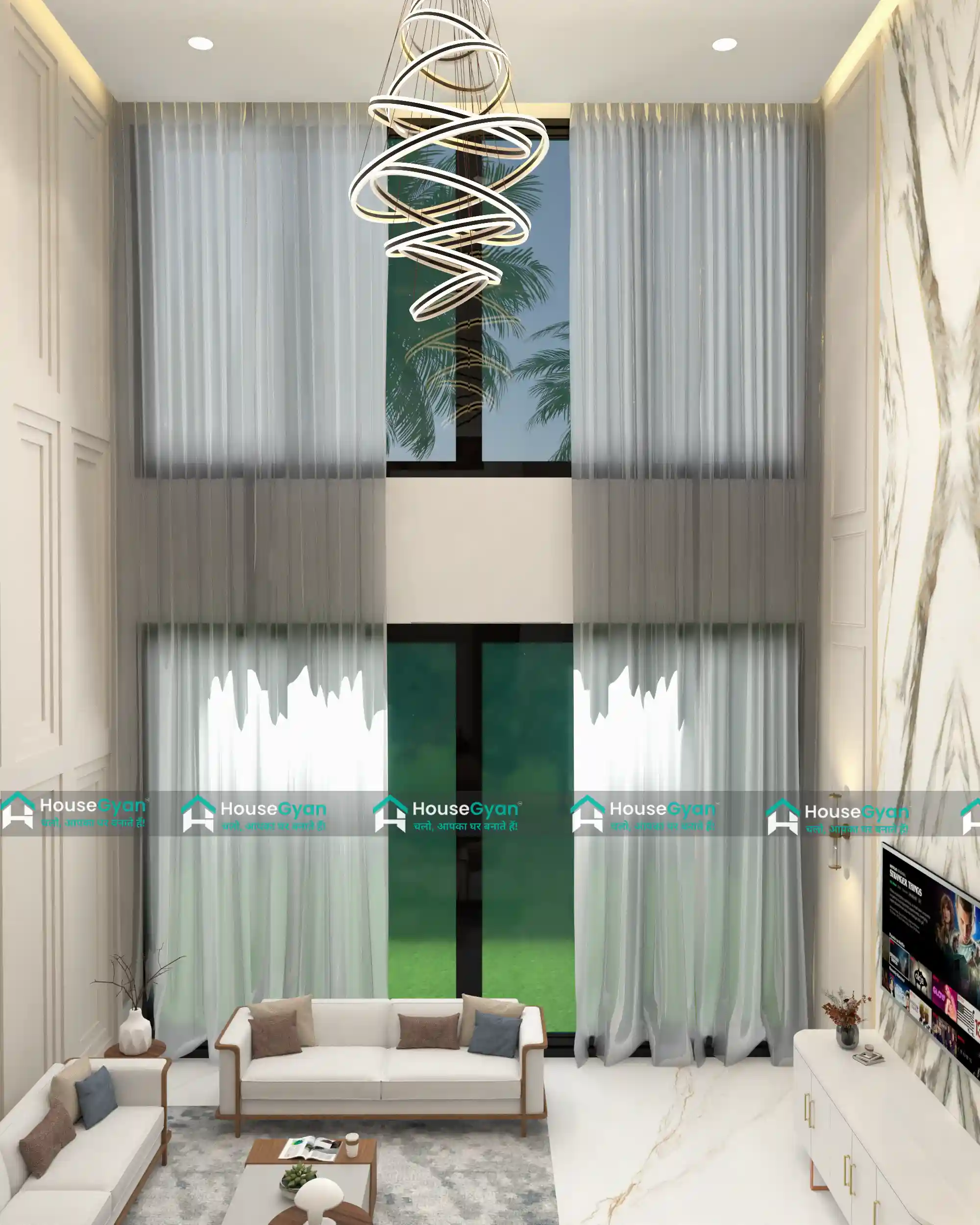 This double-height window enhances the space with abundant natural light and visual openness. The sheer floor-to-ceiling curtains soften daylight while maintaining privacy, and the tall glazing creates a grand, airy feel. Ideal for living rooms and double-height spaces, it elevates interiors with a luxurious, modern aesthetic and a strong indoor-outdoor connection.