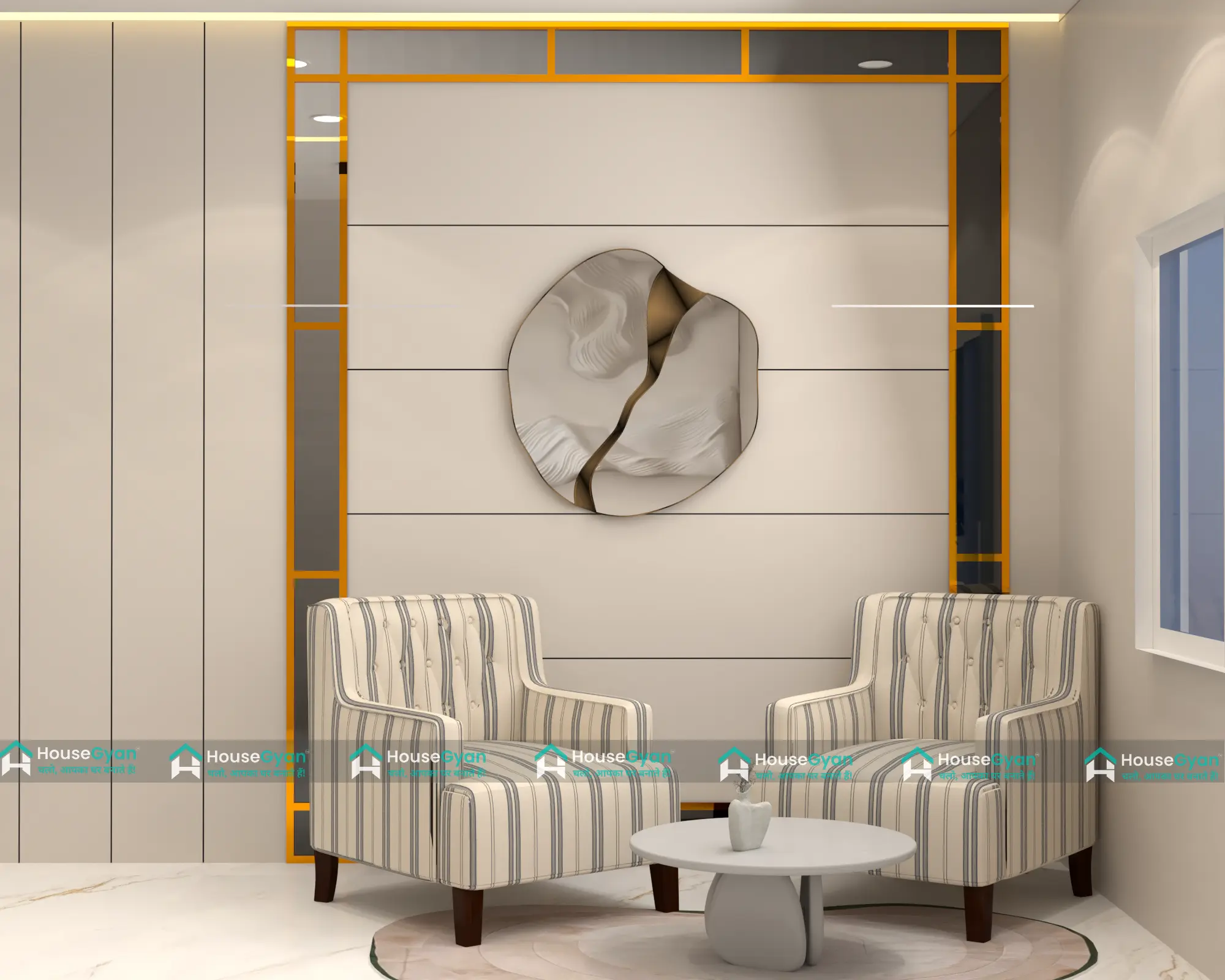 This modern entrance foyer sitting design features a refined seating arrangement ideal for both formal and informal meetings. The space is highlighted with a golden back panel that adds a touch of luxury, while the artistic mirror artifact enhances depth and visual appeal. Neutral tones, clean lines, and elegant furniture create a welcoming yet sophisticated first impression, making this foyer design perfect for contemporary homes seeking style and functionality.