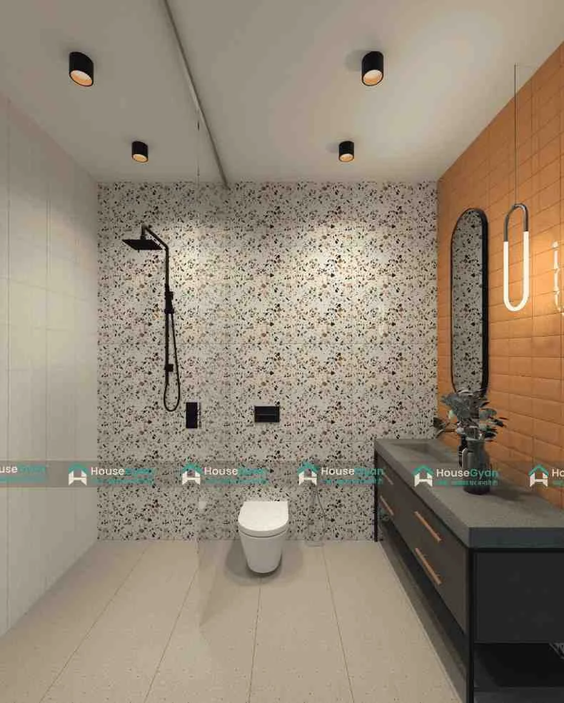 This stylish bathroom brings a refreshing blend of textures and tones, anchored by a terrazzo feature wall that adds subtle vibrance to the space. The matte-black shower fittings and sanitary fixtures offer a sharp contemporary contrast, while the warm terracotta-tone vanity wall elevates the overall ambience. Soft ceiling lights cast a gentle glow, highlighting the clean countertop, arched mirror, and elegant storage drawers. Designed for comfort and modern aesthetics, this layout turns a compact bathroom into a refined, spa-like retreat.
