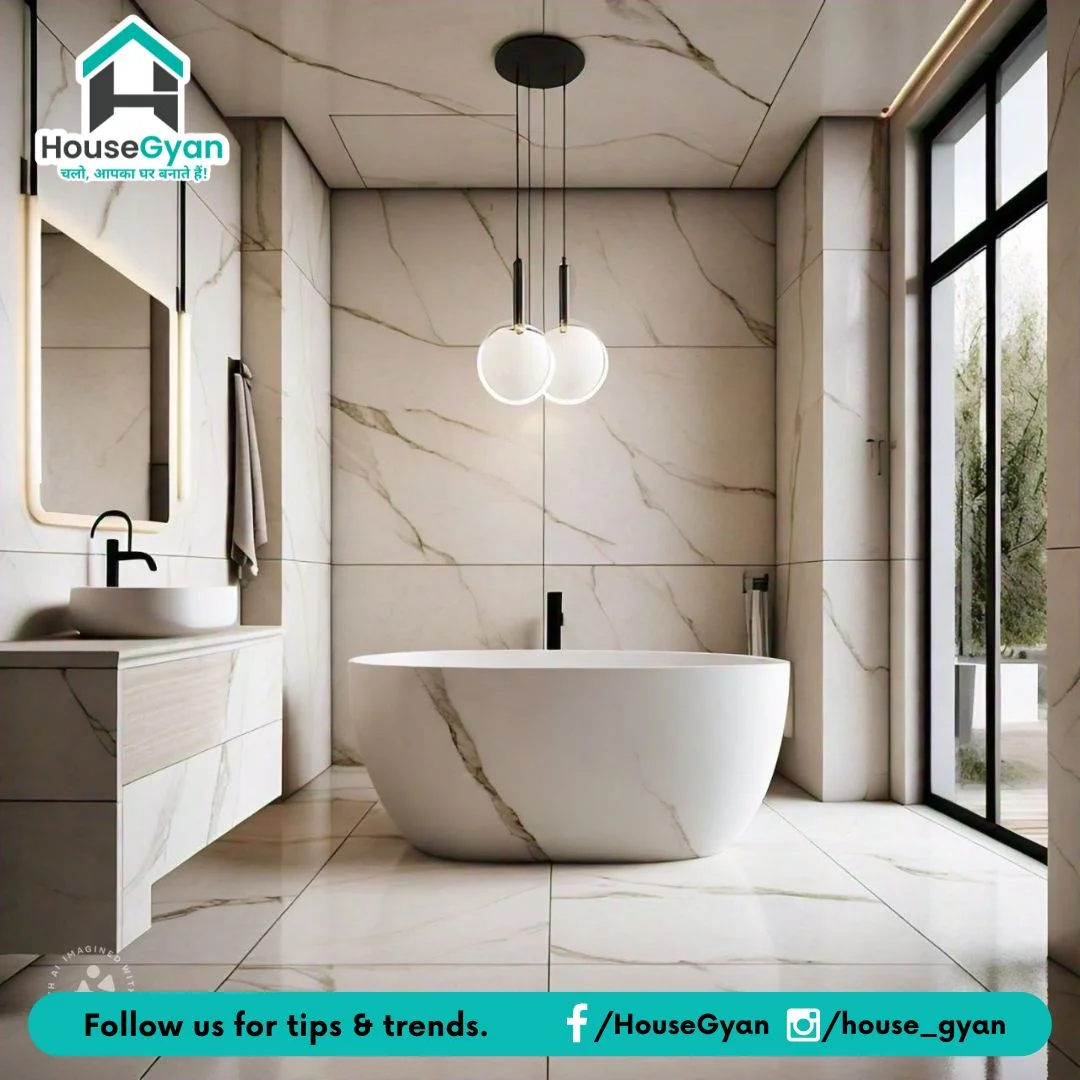 Discover a minimalist bathroom design featuring elegant white marble tiles and stylish pendant lights for a clean, modern aesthetic.