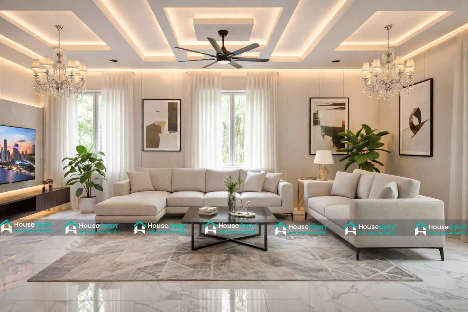 Designed for premium homes, this luxury living room interior includes a stylish false ceiling, ambient LED lighting, and tasteful chandeliers. The neutral color scheme, elegant seating arrangement, and indoor plants create a warm and inviting environment. Ideal for homeowners seeking modern living room décor ideas with a classy touch.