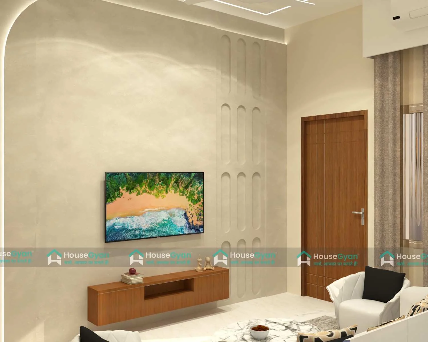 This modern living room embraces a soft, minimalist aesthetic, highlighted by a sculpted beige accent wall that adds quiet depth and character to the space. The floating TV console keeps the layout clean and airy, while the curved lounge chairs and marble-top center table create a cozy, conversational nook. Subtle cove lighting, warm wooden doors, and floor-to-ceiling curtains work together to build a calm, refined atmosphere. Perfect for contemporary homes, this design blends comfort with understated luxury, turning the living area into a serene everyday retreat.