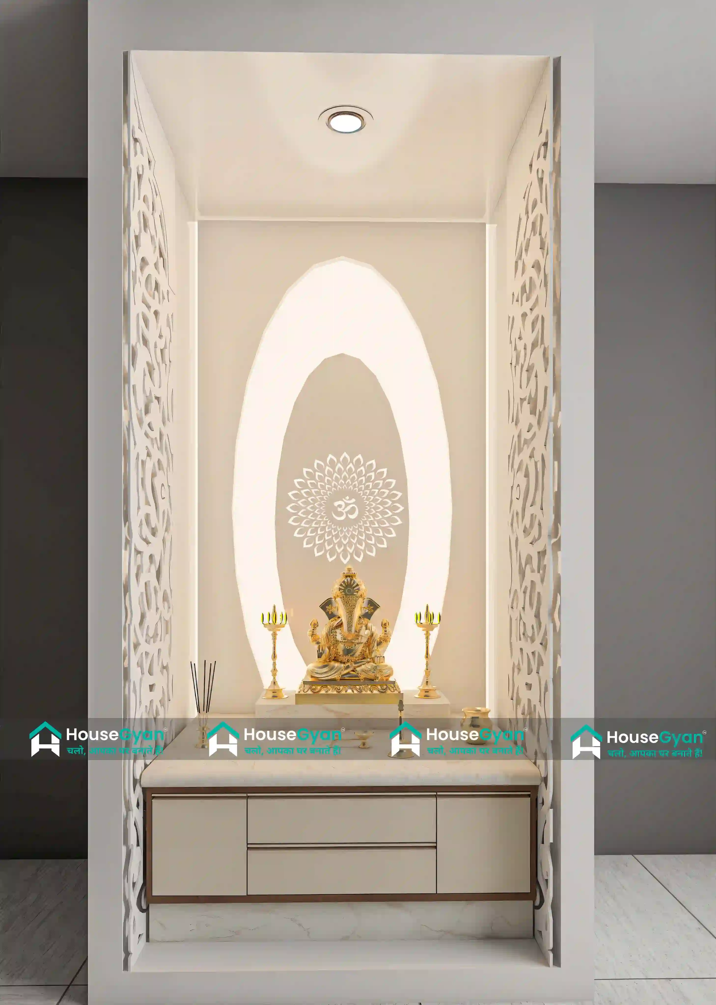 This modern pooja room design features a serene and elegant setup with a beautifully backlit arched backdrop that highlights the deity idol. The soft warm lighting, CNC-cut side panels, and clean white-and-beige color palette create a peaceful spiritual atmosphere. A marble-finish base unit with storage adds functionality, while minimal décor elements enhance the overall divine look. Perfect for contemporary homes seeking a stylish yet calm pooja space.